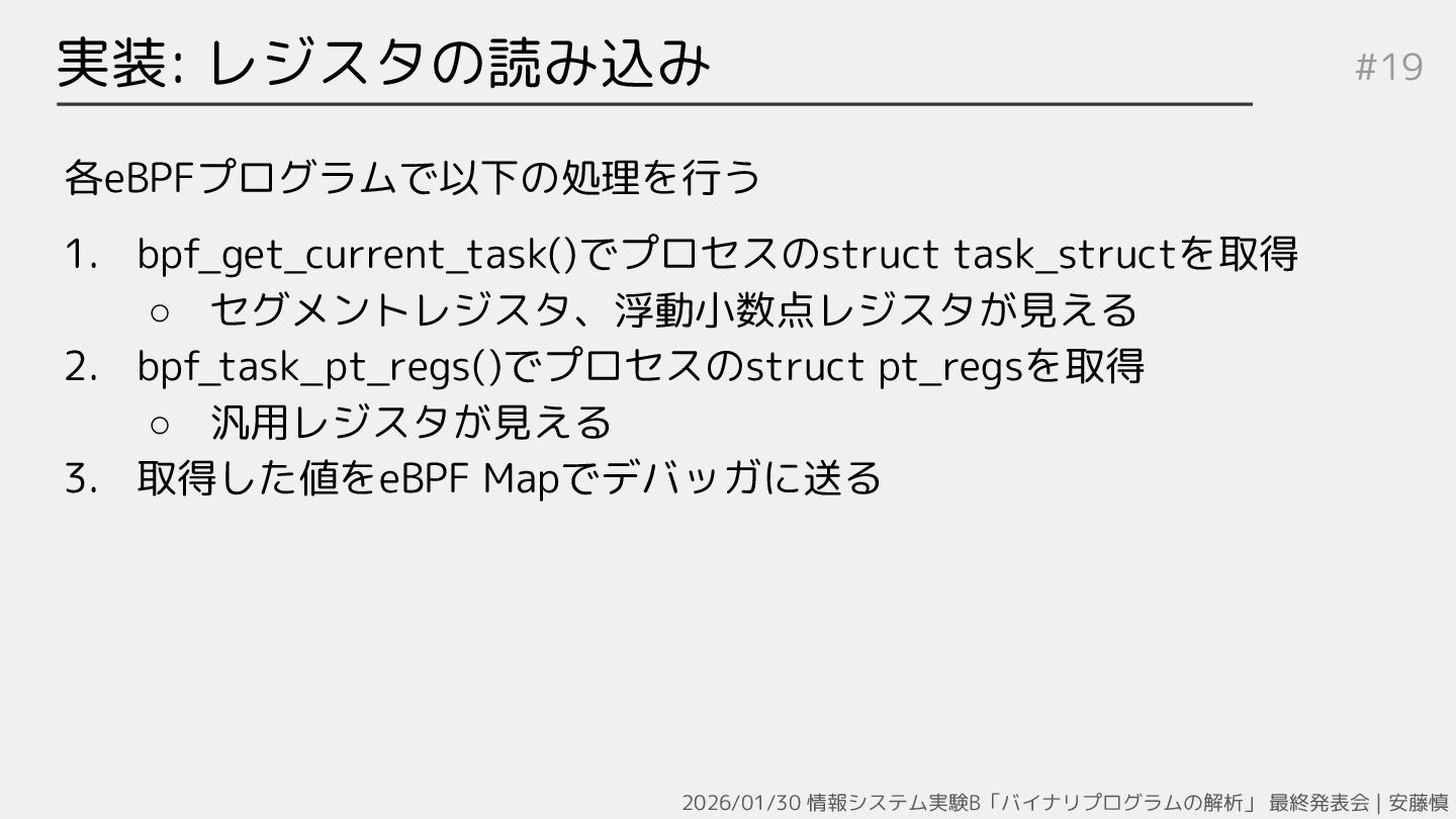 セグメントレジスタ、浮動小数点レジスタが見える 2. bpf_task_pt_regs()でプロセスのstruct pt_regsを取得 ◦ 汎用レジスタが見える 3. 取得した値をeBPF Mapでデバッガに送る 実装: レジスタの読み込み #19