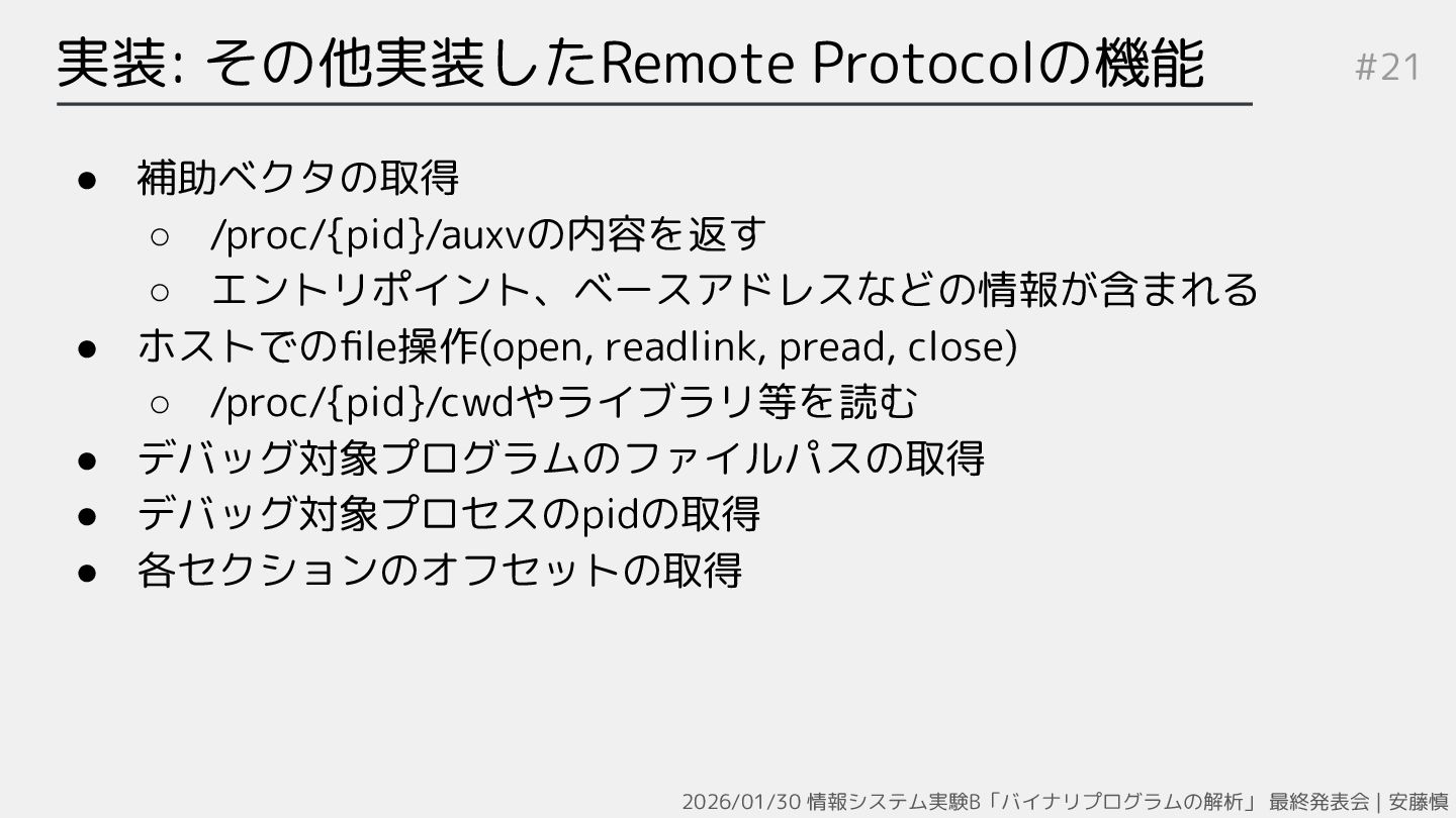 エントリポイント、ベースアドレスなどの情報が含まれる • ホストでのfile操作(open, readlink, pread, close) ◦ /proc/{pid}/cwdやライブラリ等を読む • デバッグ対象プログラムのファイルパスの取得 • デバッグ対象プロセスのpidの取得 • 各セクションのオフセットの取得 実装: その他実装したRemote Protocolの機能 #21