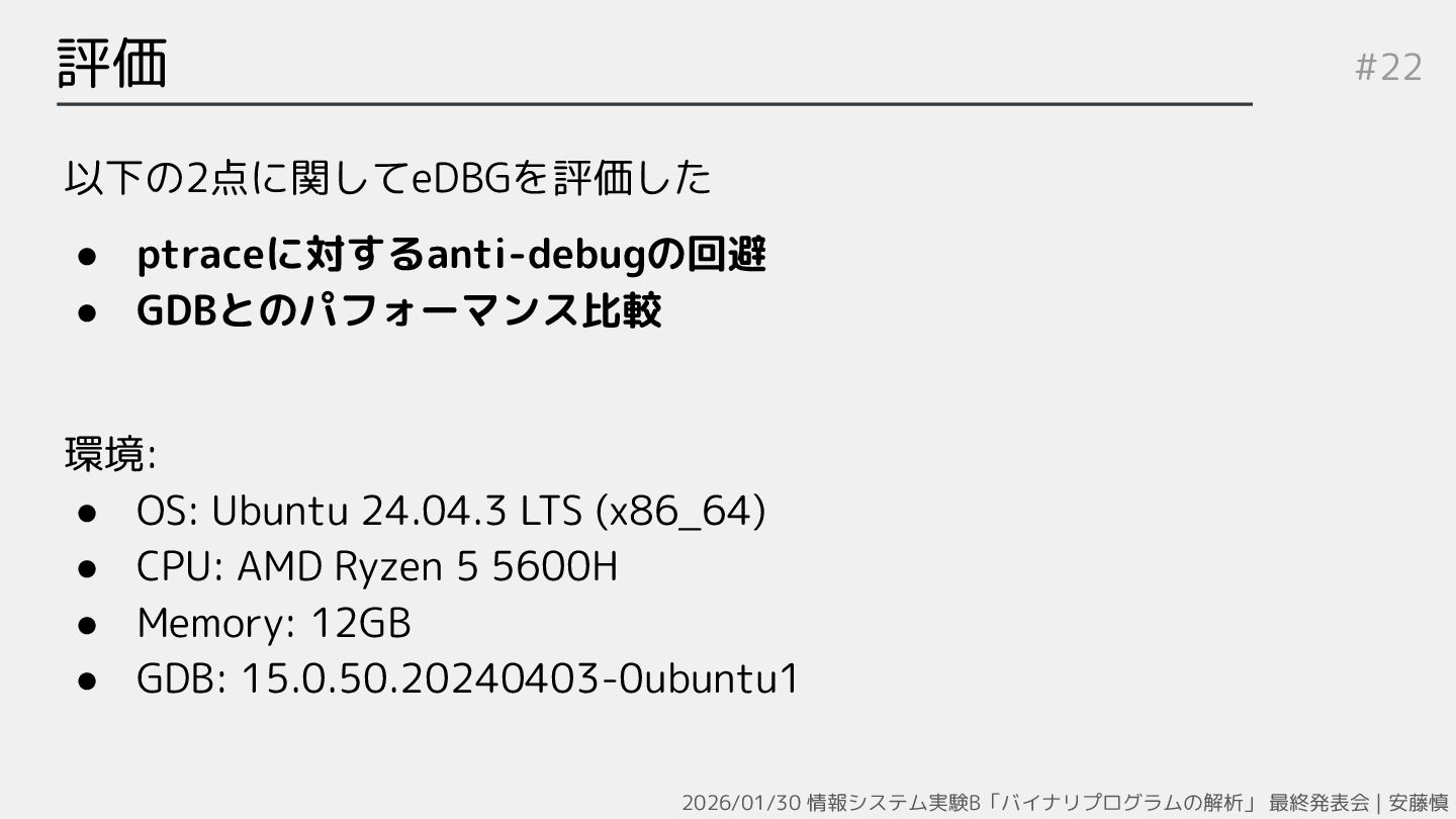 2026/01/30 情報システム実験B「バイナリプログラムの解析」 最終発表会 | 安藤慎 以下の2点に関してeDBGを評価した • ptraceに対するanti-debugの回避 • GDBとのパフォーマンス比較