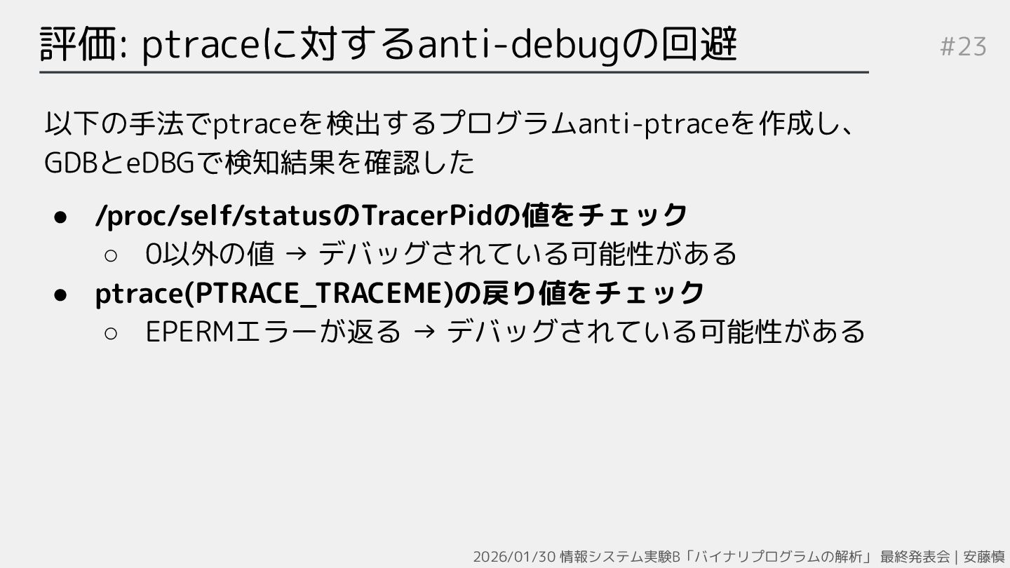 2026/01/30 情報システム実験B「バイナリプログラムの解析」 最終発表会 | 安藤慎 以下の手法でptraceを検出するプログラムanti-ptraceを作成し、 GDBとeDBGで検知結果を確認した • /proc/self/statusのTracerPidの値をチェック ◦