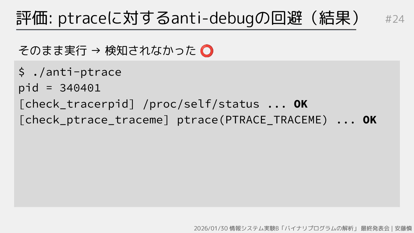 2026/01/30 情報システム実験B「バイナリプログラムの解析」 最終発表会 | 安藤慎 $ ./anti-ptrace pid = 340401