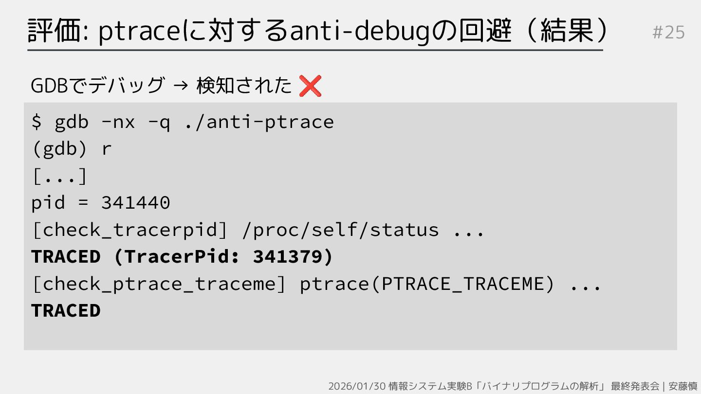 2026/01/30 情報システム実験B「バイナリプログラムの解析」 最終発表会 | 安藤慎 評価: ptraceに対するanti-debugの回避(結果) #25 $ gdb