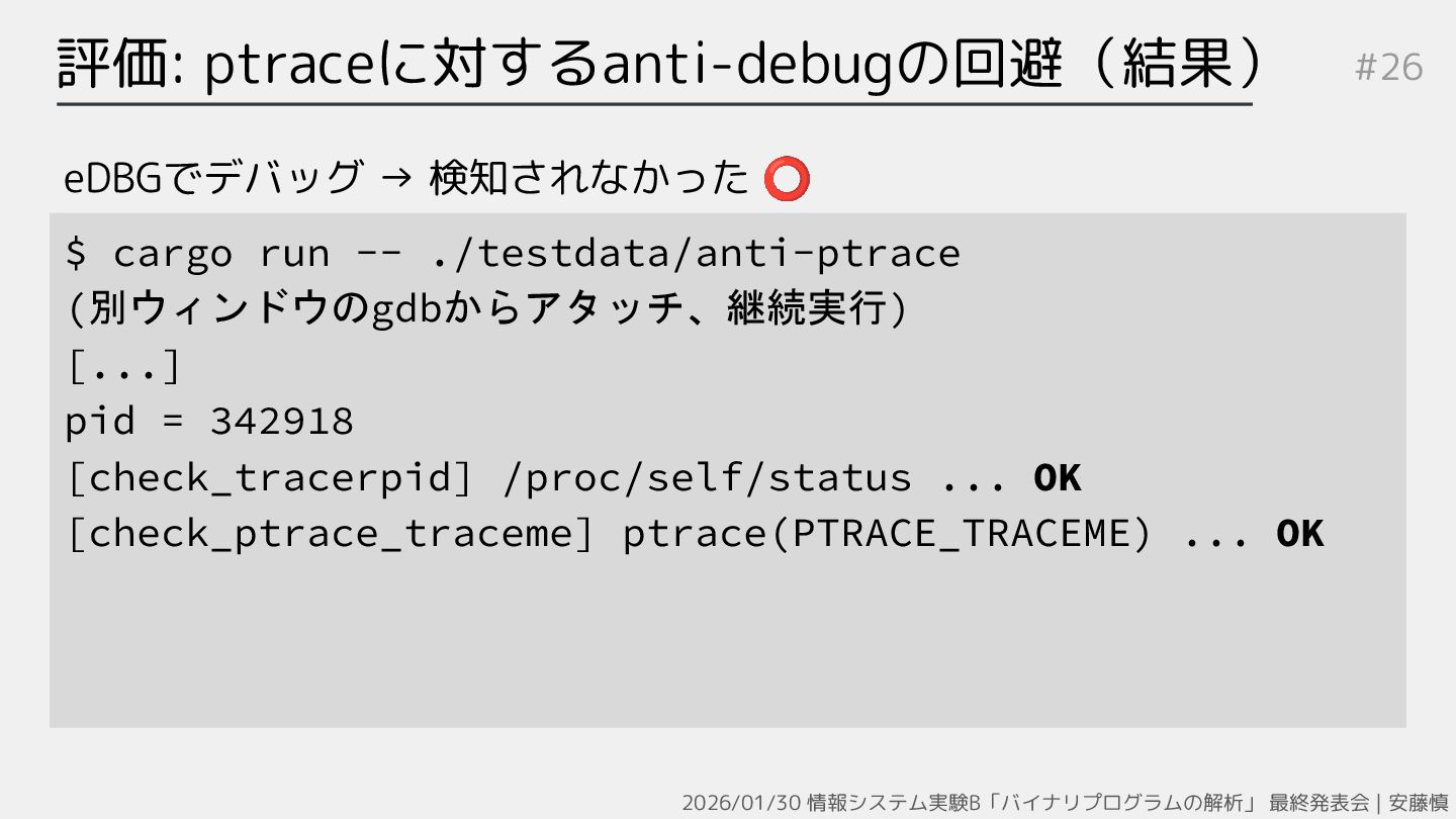 2026/01/30 情報システム実験B「バイナリプログラムの解析」 最終発表会 | 安藤慎 評価: ptraceに対するanti-debugの回避(結果) #26 $ cargo