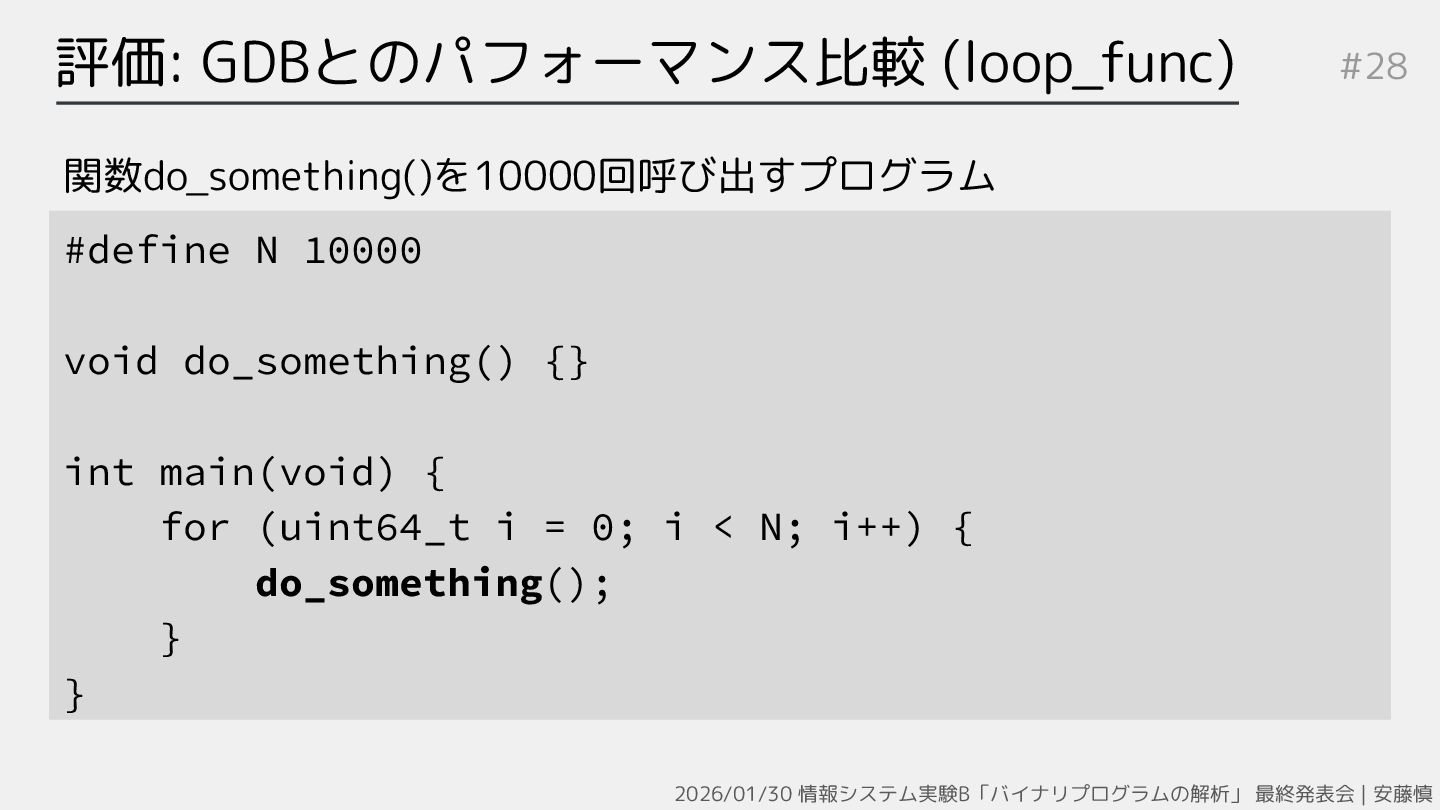2026/01/30 情報システム実験B「バイナリプログラムの解析」 最終発表会 | 安藤慎 関数do_something()を10000回呼び出すプログラム 評価: GDBとのパフォーマンス比較 (loop_func) #28