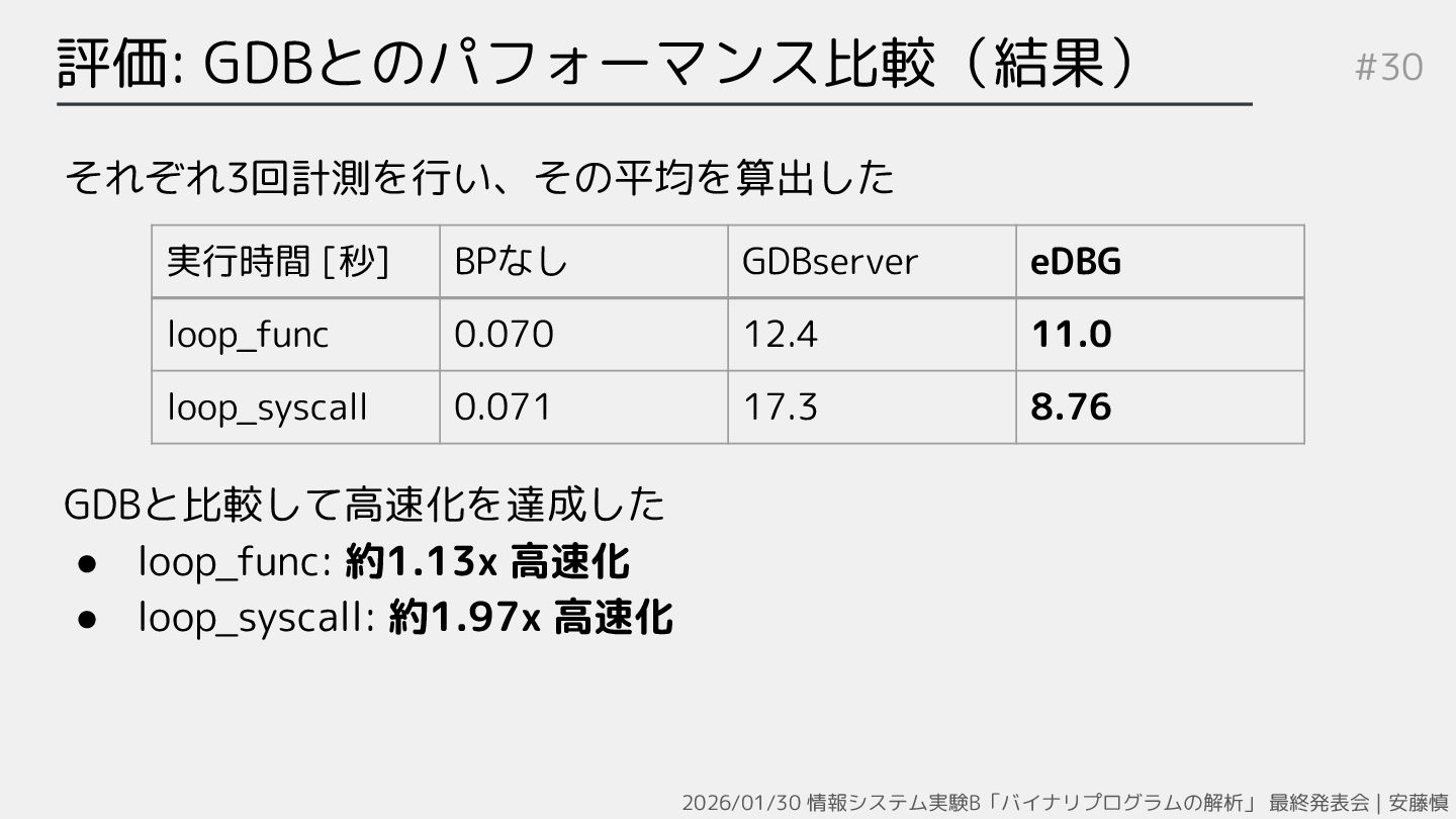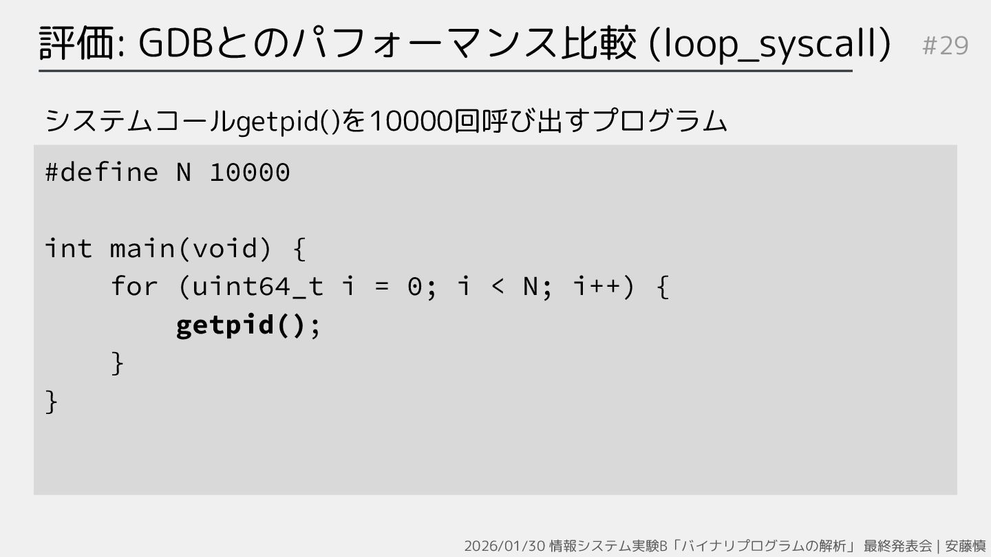 2026/01/30 情報システム実験B「バイナリプログラムの解析」 最終発表会 | 安藤慎 システムコールgetpid()を10000回呼び出すプログラム 評価: GDBとのパフォーマンス比較 (loop_syscall) #29