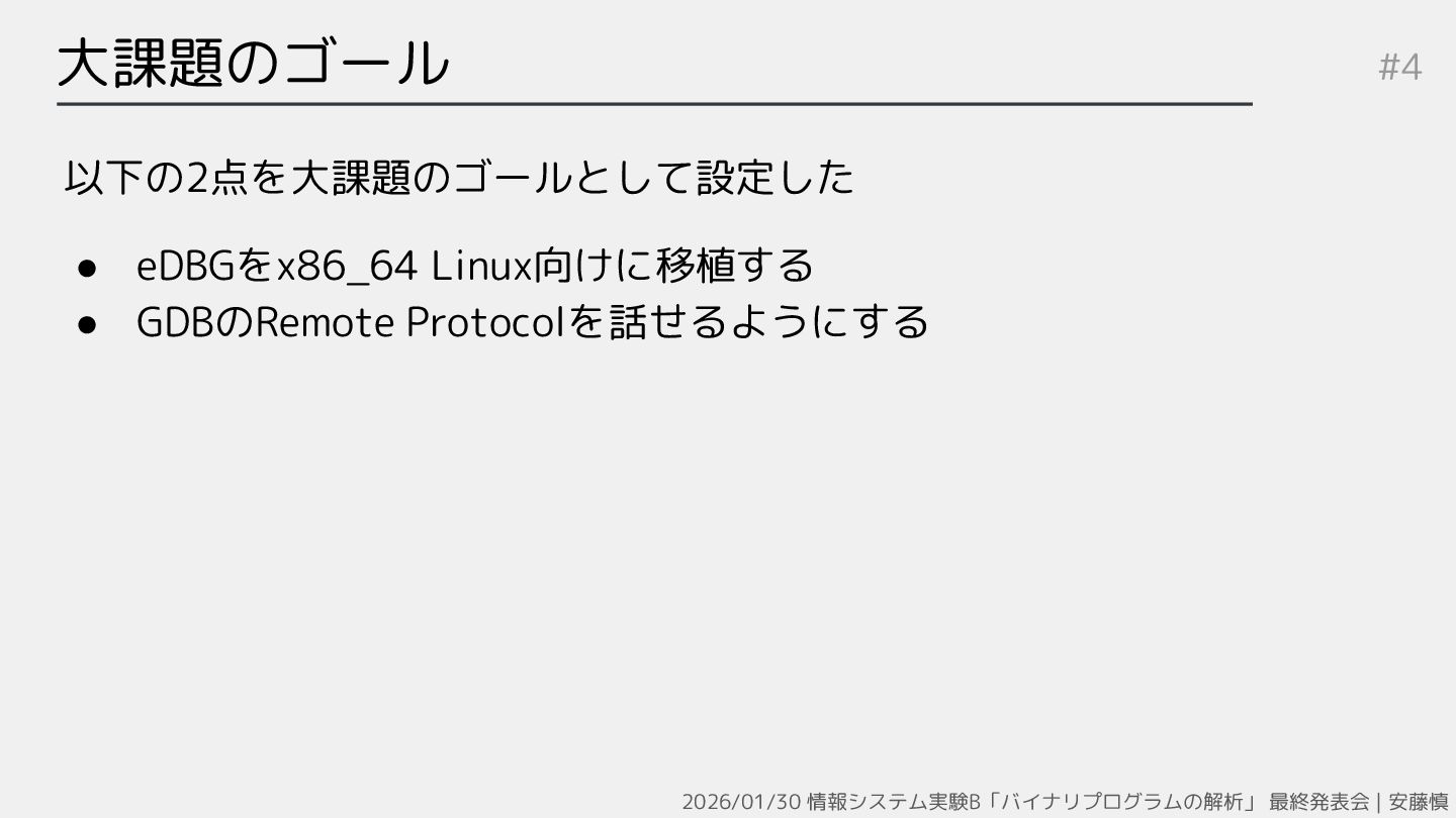2026/01/30 情報システム実験B「バイナリプログラムの解析」 最終発表会 | 安藤慎 以下の2点を大課題のゴールとして設定した • eDBGをx86_64 Linux向けに移植する •