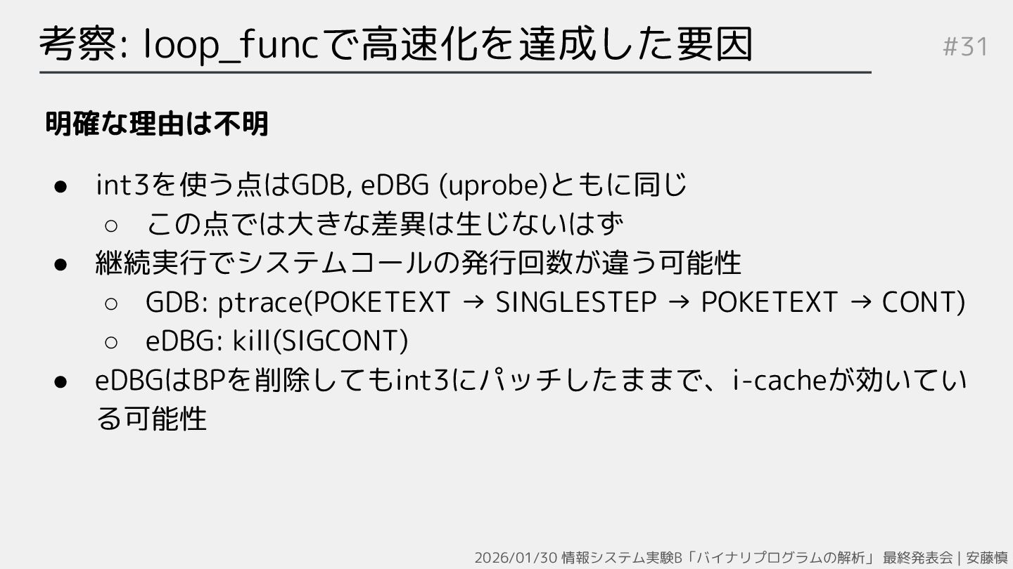 ◦ この点では大きな差異は生じないはず • 継続実行でシステムコールの発行回数が違う可能性 ◦ GDB: ptrace(POKETEXT → SINGLESTEP → POKETEXT → CONT) ◦ eDBG: kill(SIGCONT) • eDBGはBPを削除してもint3にパッチしたままで、i-cacheが効いてい る可能性 考察: loop_funcで高速化を達成した要因 #31