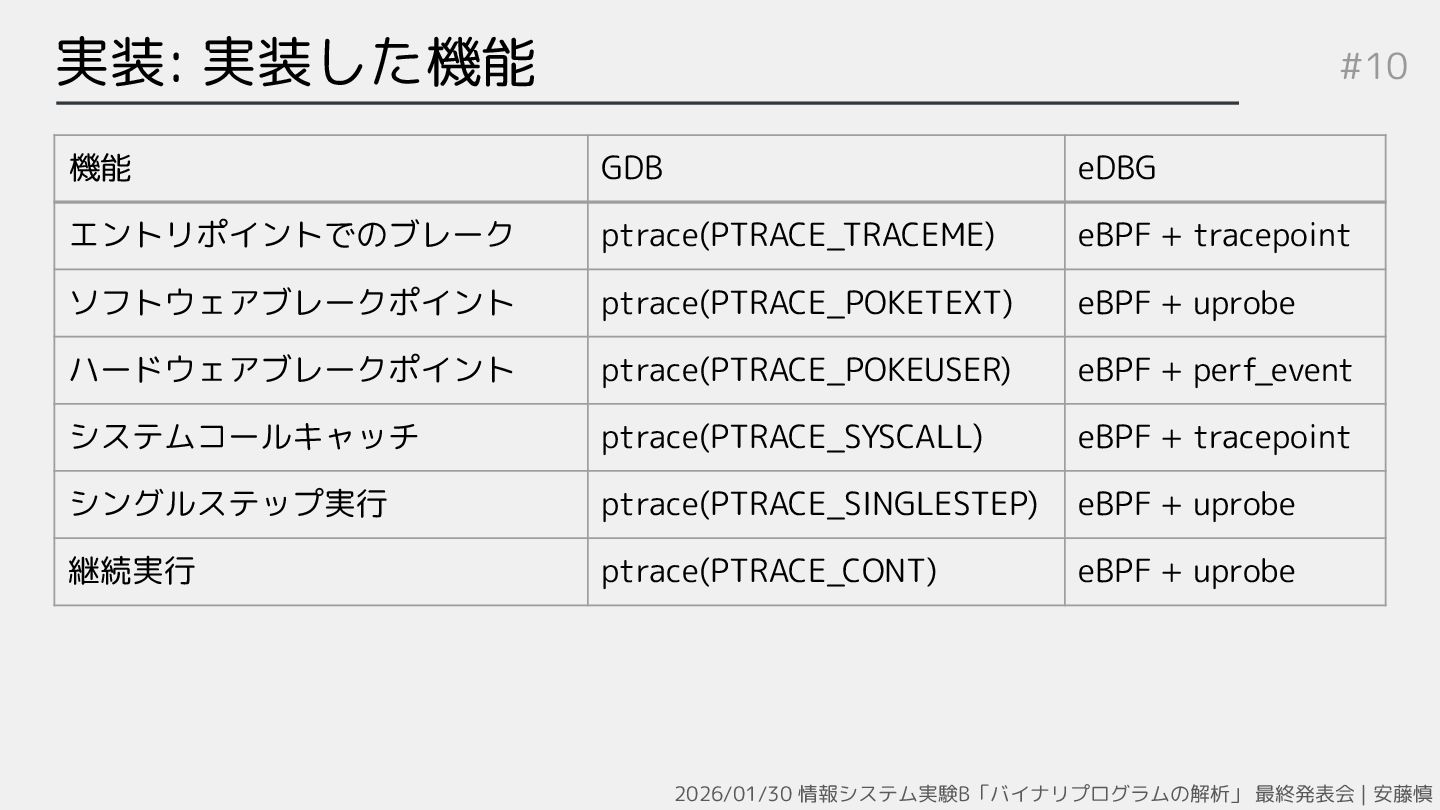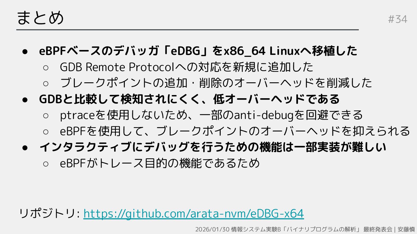 2026/01/30 情報システム実験B「バイナリプログラムの解析」 最終発表会 | 安藤慎 • eBPFベースのデバッガ「eDBG」をx86_64 Linuxへ移植した ◦ GDB