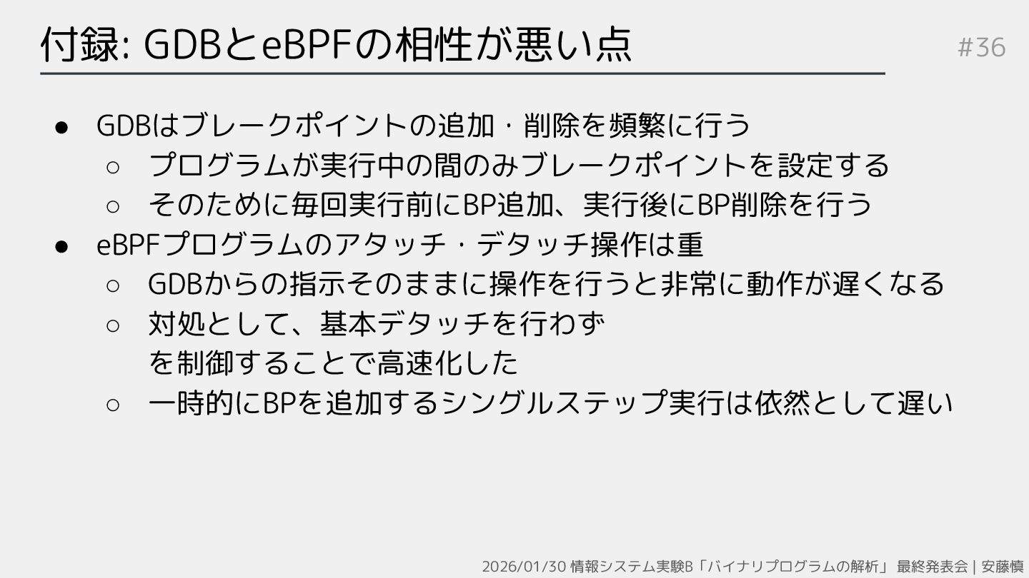 そのために毎回実行前にBP追加、実行後にBP削除を行う • eBPFプログラムのアタッチ・デタッチ操作は重い ◦ GDBからの指示そのままに操作を行うと非常に動作が遅くなる ◦ 対処として、基本デタッチを行わず、eBPF MapでBPの有効/無効 を制御することで高速化した ◦ 一時的にBPを追加するシングルステップ実行は依然として遅い 付録: GDBとeBPFの相性が悪い点 #36