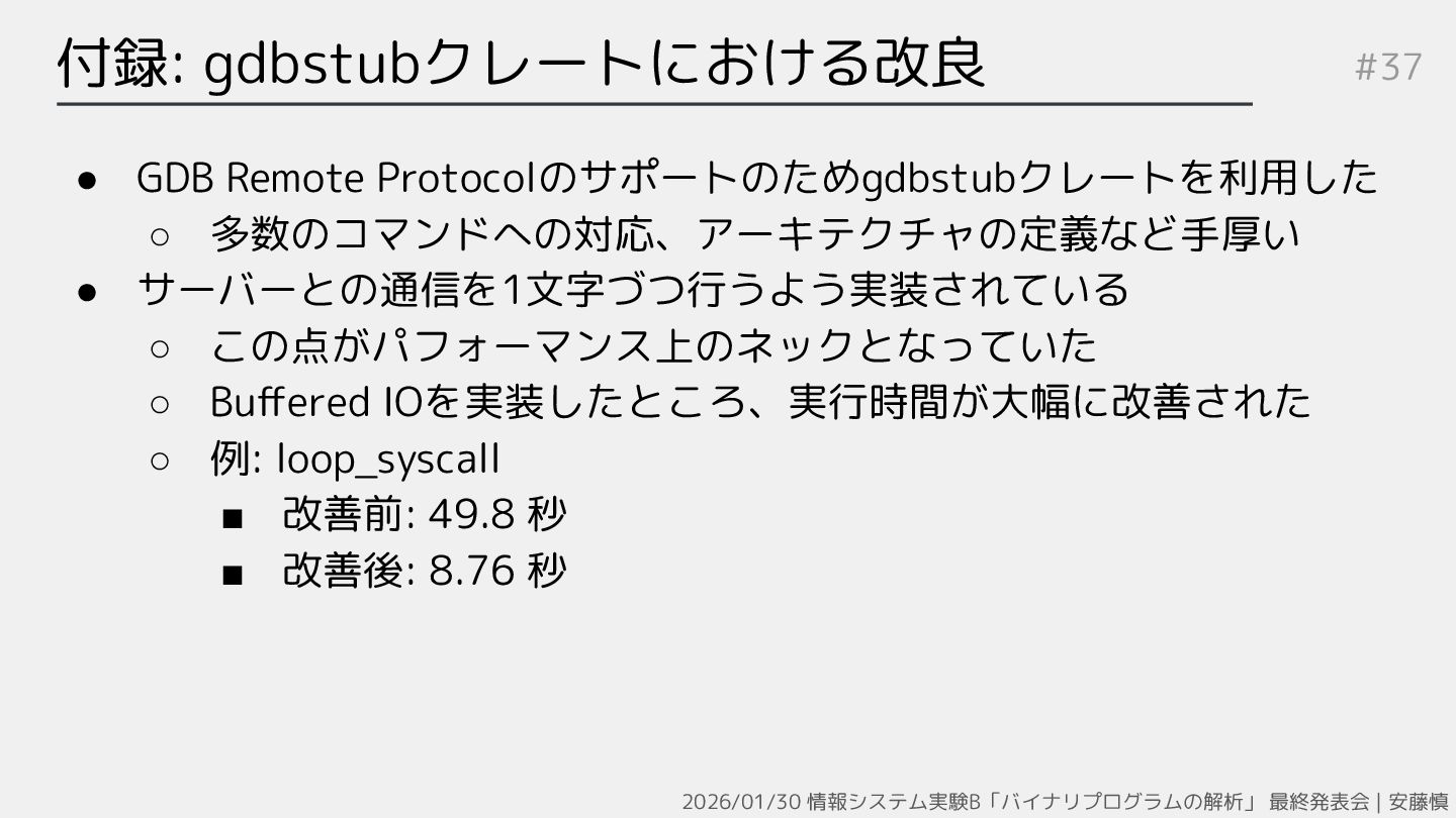 2026/01/30 情報システム実験B「バイナリプログラムの解析」 最終発表会 | 安藤慎 • GDB Remote Protocolのサポートのためgdbstubクレートを利用した ◦