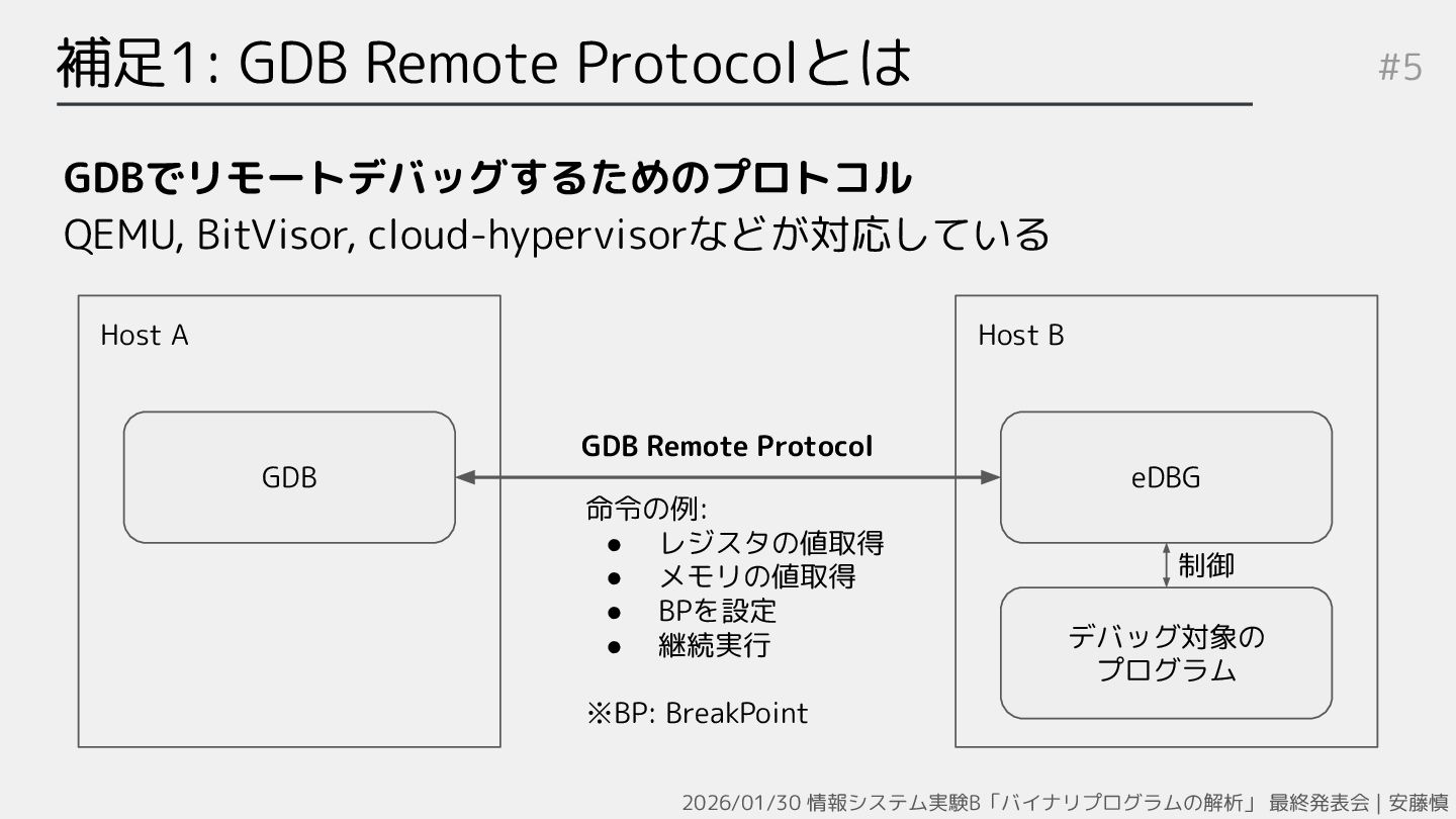 2026/01/30 情報システム実験B「バイナリプログラムの解析」 最終発表会 | 安藤慎 GDBでリモートデバッグするためのプロトコル QEMU, BitVisor, cloud-hypervisorなどが対応している 補足1:
