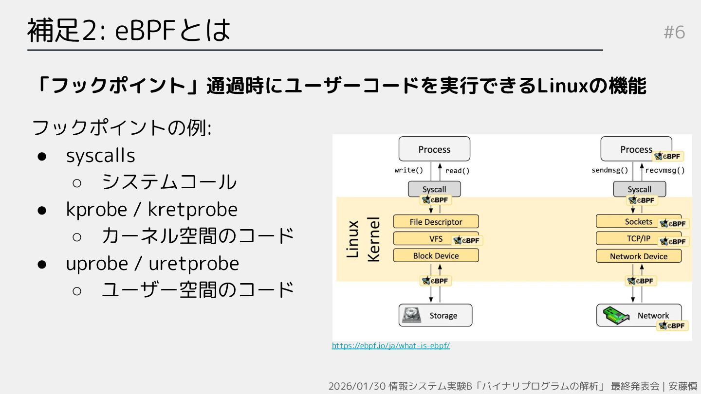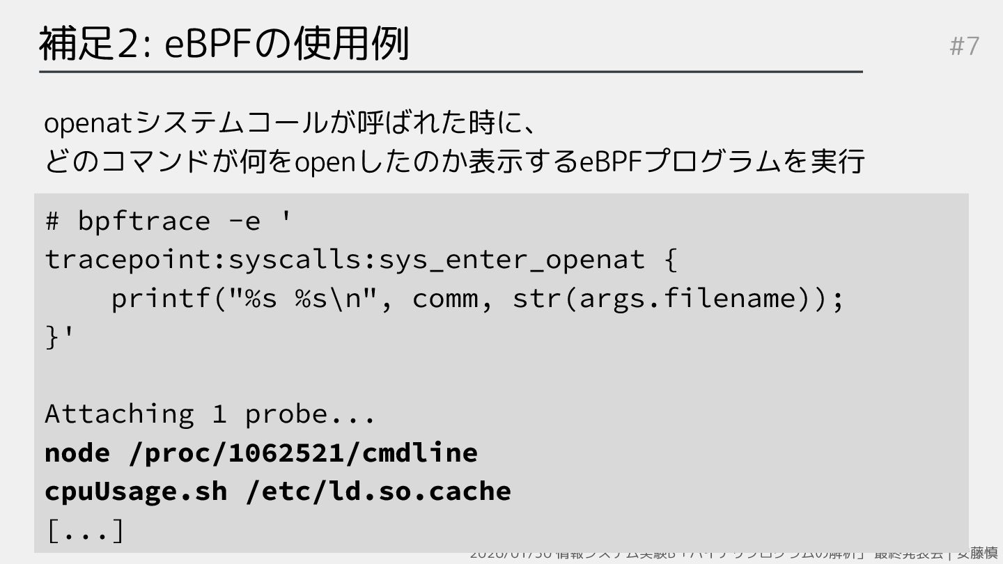 2026/01/30 情報システム実験B「バイナリプログラムの解析」 最終発表会 | 安藤慎 openatシステムコールが呼ばれた時に、 どのコマンドが何をopenしたのか表示するeBPFプログラムを実行 補足2: eBPFの使用例 #7