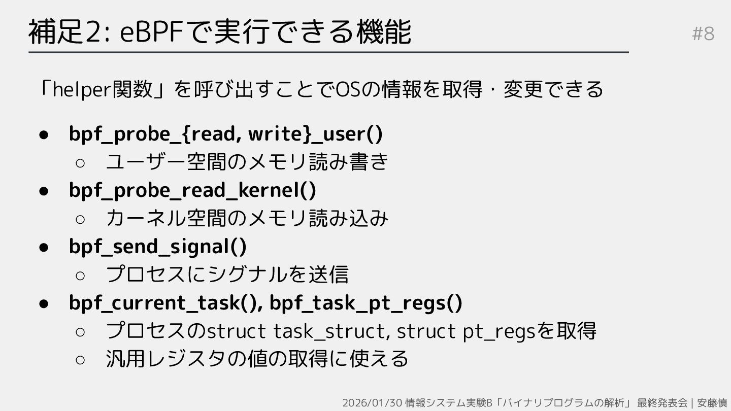 2026/01/30 情報システム実験B「バイナリプログラムの解析」 最終発表会 | 安藤慎 「helper関数」を呼び出すことでOSの情報を取得・変更できる • bpf_probe_{read, write}_user() ◦