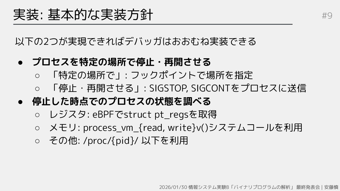 2026/01/30 情報システム実験B「バイナリプログラムの解析」 最終発表会 | 安藤慎 以下の2つが実現できればデバッガはおおむね実装できる • プロセスを特定の場所で停止・再開させる ◦ 「特定の場所で」: