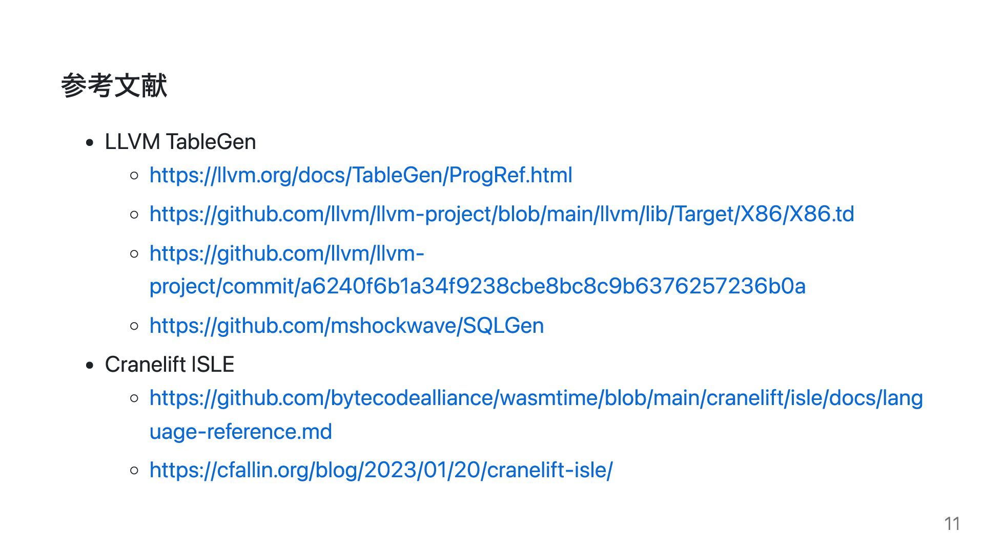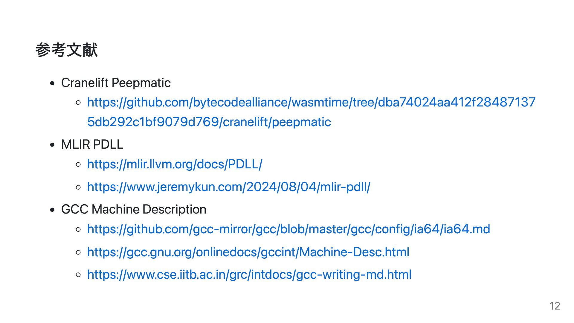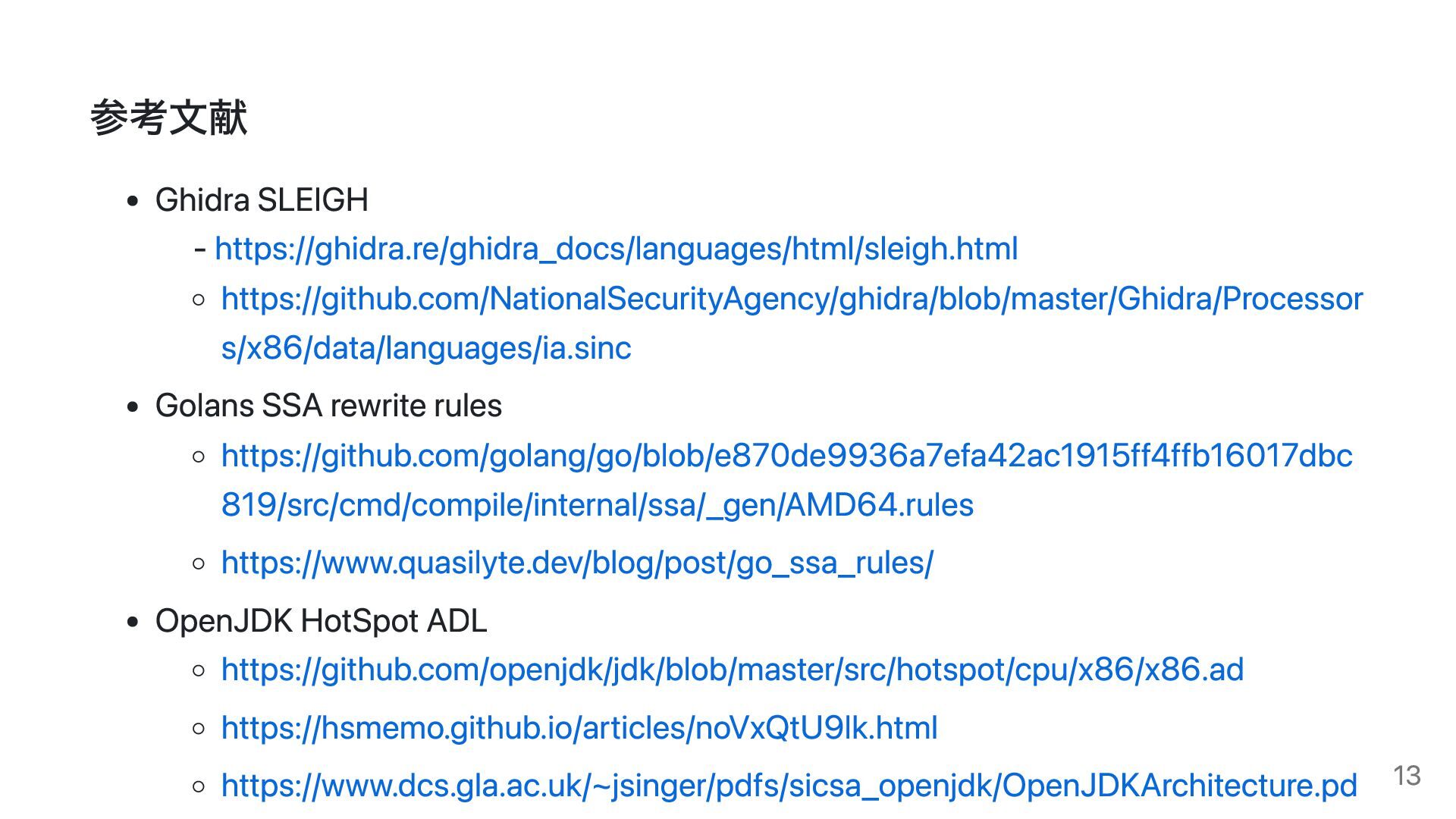 rewrite rules https://github.com/golang/go/blob/e870de9936a7efa42ac1915ff4ffb16017dbc 819/src/cmd/compile/internal/ssa/_gen/AMD64.rules https://www.quasilyte.dev/blog/post/go_ssa_rules/ OpenJDK HotSpot ADL https://github.com/openjdk/jdk/blob/master/src/hotspot/cpu/x86/x86.ad https://hsmemo.github.io/articles/noVxQtU9lk.html https://www.dcs.gla.ac.uk/~jsinger/pdfs/sicsa_openjdk/OpenJDKArchitecture.pd 13