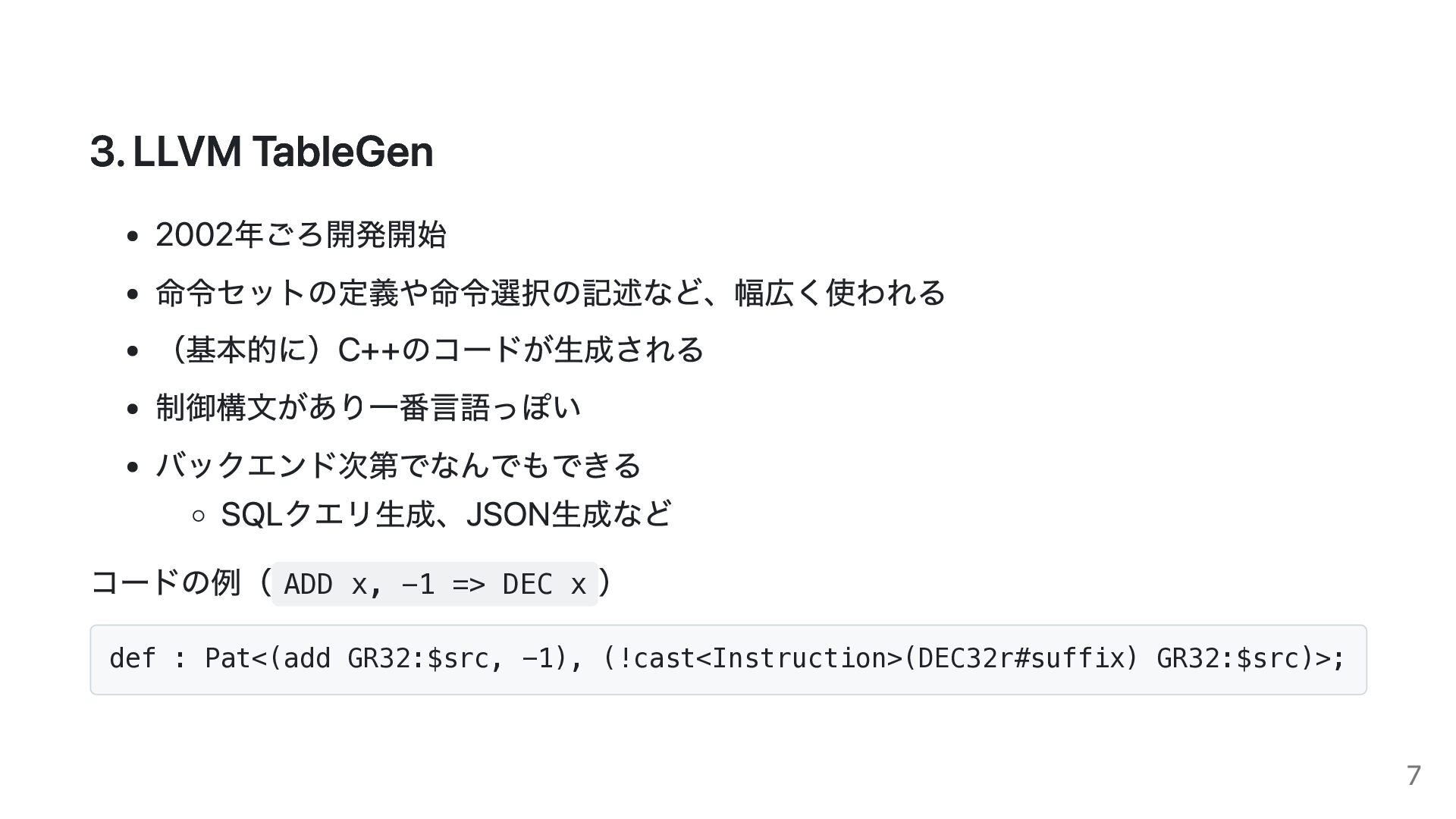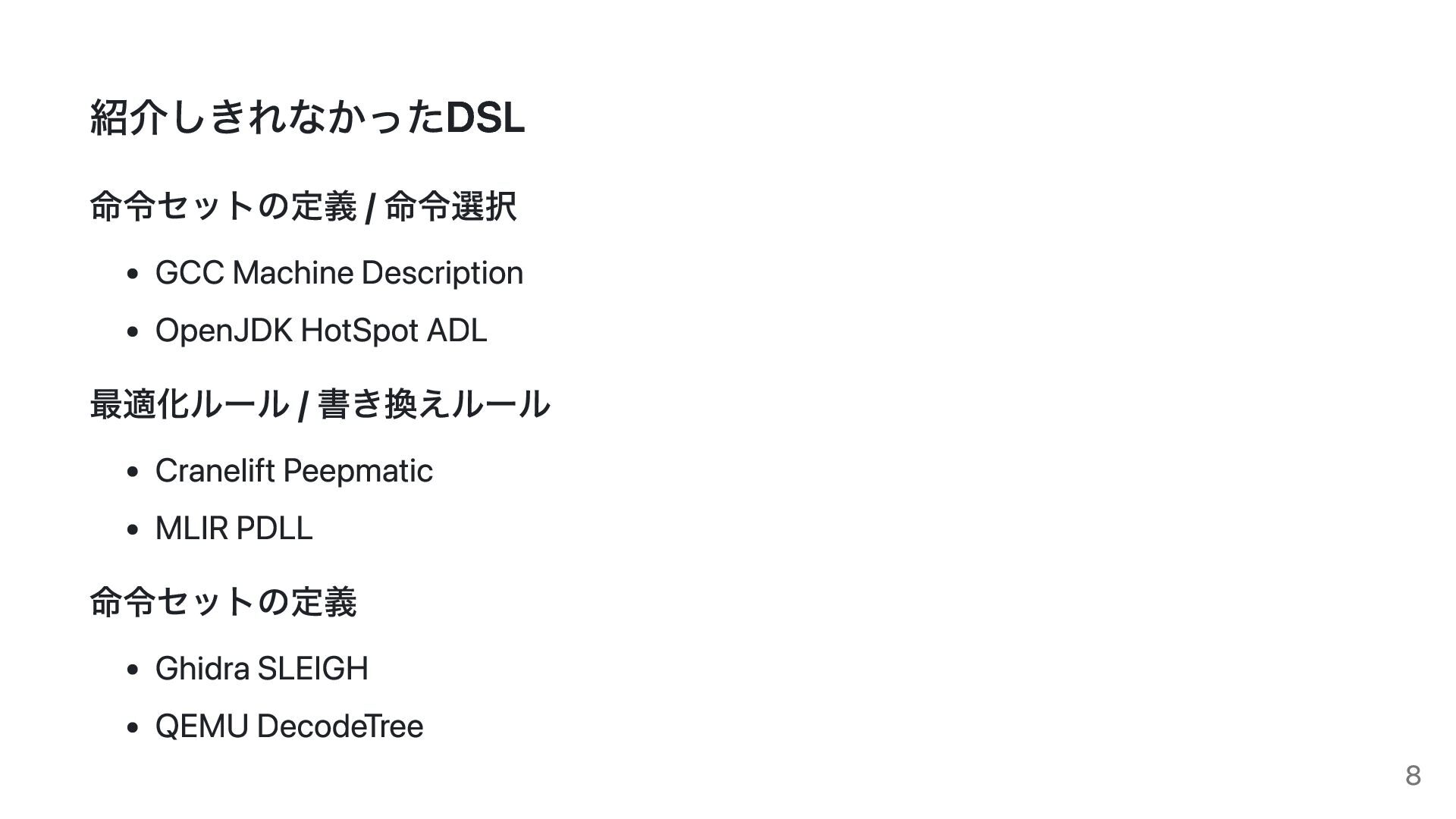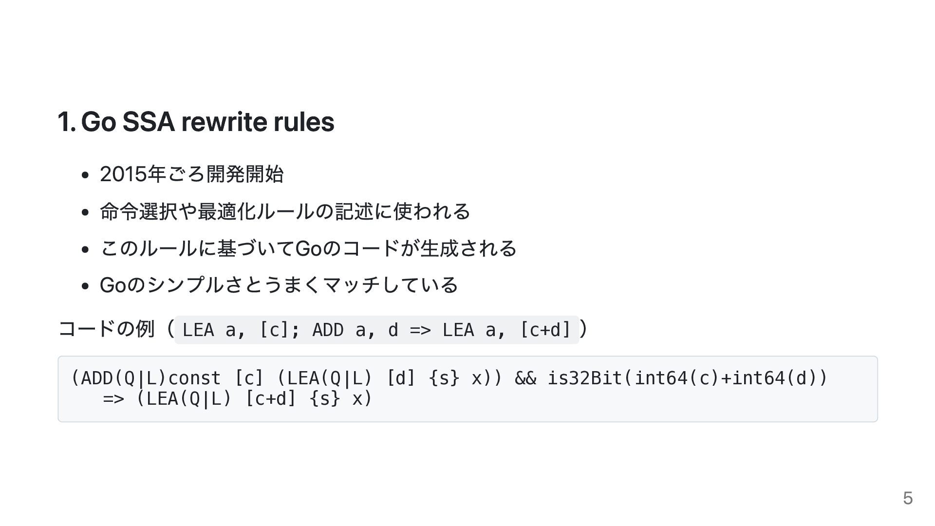 rewrite rules https://github.com/golang/go/blob/e870de9936a7efa42ac1915ff4ffb16017dbc 819/src/cmd/compile/internal/ssa/_gen/AMD64.rules https://www.quasilyte.dev/blog/post/go_ssa_rules/ OpenJDK HotSpot ADL https://github.com/openjdk/jdk/blob/master/src/hotspot/cpu/x86/x86.ad https://hsmemo.github.io/articles/noVxQtU9lk.html https://www.dcs.gla.ac.uk/~jsinger/pdfs/sicsa_openjdk/OpenJDKArchitecture.pd 13