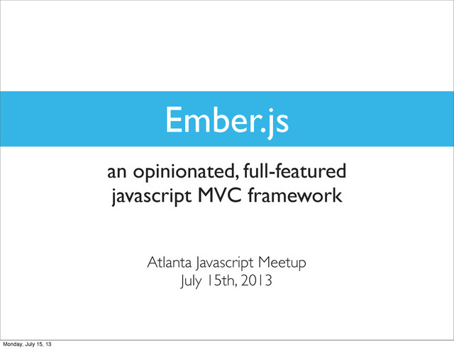 logic-less templates • router (urls) • Ember-data (like ActiveRecord) • Separation of data store from presentation (services!) You’ll be confused by: • Event-driven architecture (inversion of control, subscription) • Responsibility of routers • ObjectController vs ArrayController • Asynchronicity/promises Monday, July 15, 13