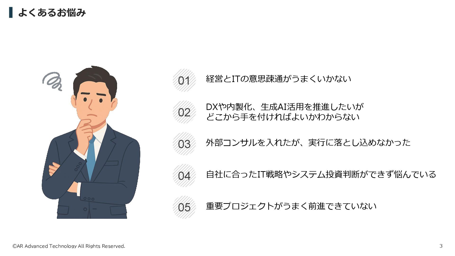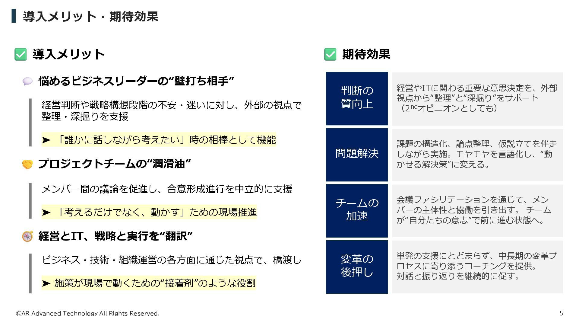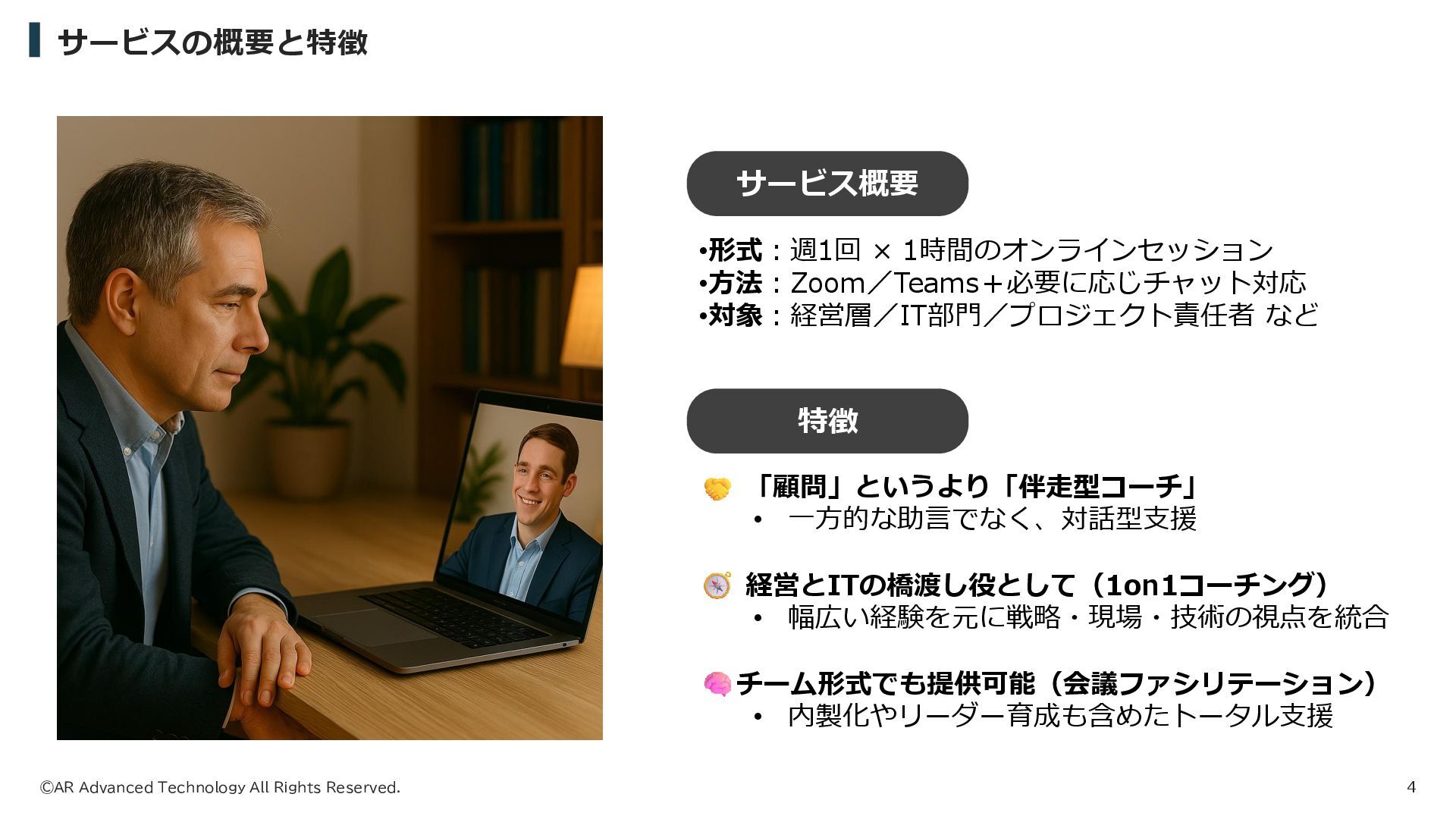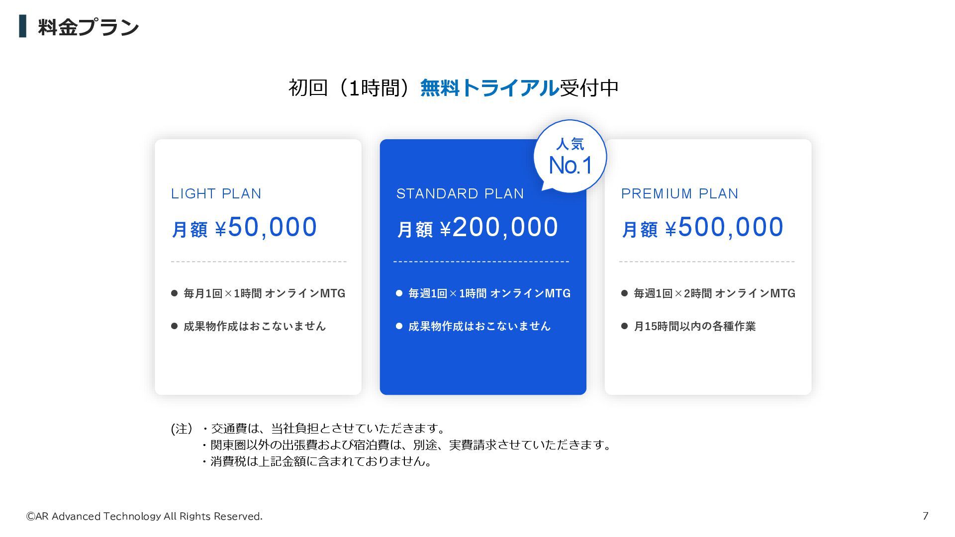月額 ¥50,000 ⚫ 毎月1回×1時間 オンラインMTG ⚫ 成果物作成はおこないません STANDARD PLAN 月額 ¥200,000 ⚫ 毎週1回×1時間 オンラインMTG ⚫ 成果物作成はおこないません PREMIUM PLAN 月額 ¥500,000 ⚫ 毎週1回×2時間 オンラインMTG ⚫ 月15時間以内の各種作業 No.1 人気 (注)・交通費は、当社負担とさせていただきます。 ・関東圏以外の出張費および宿泊費は、別途、実費請求させていただきます。 ・消費税は上記金額に含まれておりません。 初回(1時間)無料トライアル受付中