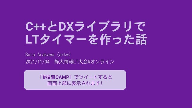 C++とDXライブラリで LTタイマーを作った話 Sora Arakawa (arkw) 2021/11/04 静大情報LT大会@オンライン 「#技育CAMP」でツイートすると 画面上部に表示されます!