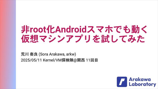 非root化Androidスマホでも動く 仮想マシンアプリを試してみた 荒川 奏良 (Sora Arakawa, arkw) 2025/05/11 Kernel/VM探検隊@関西 11回目