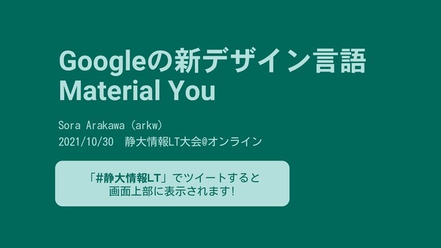 Googleの新デザイン言語 Material You Sora Arakawa (arkw) 2021/10/30 静大情報LT大会@オンライン 「#静大情報LT」でツイートすると 画面上部に表示されます!