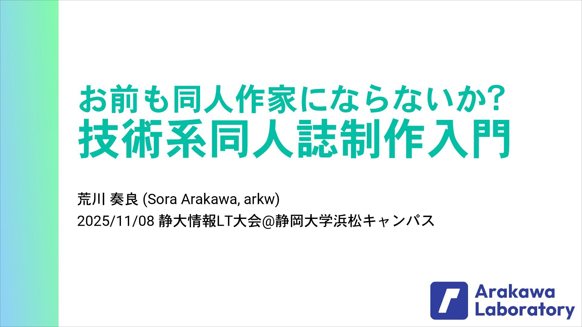 お前も同人作家にならないか? 技術系同人誌制作入門 荒川 奏良 (Sora Arakawa, arkw) 2025/11/08 静大情報LT大会@静岡大学浜松キャンパス