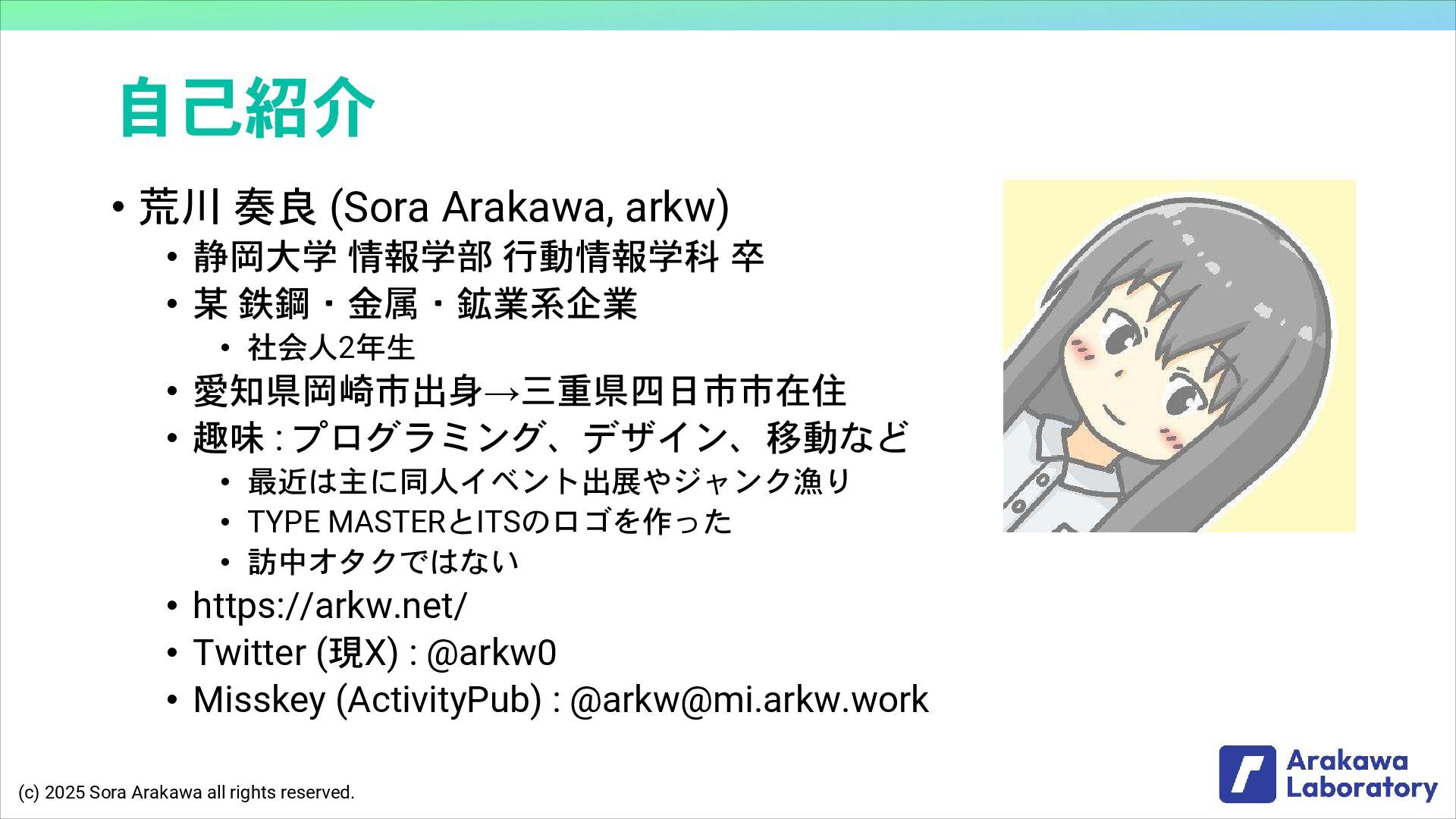 (c) 2025 Sora Arakawa all rights reserved. 自己紹介 • 荒川