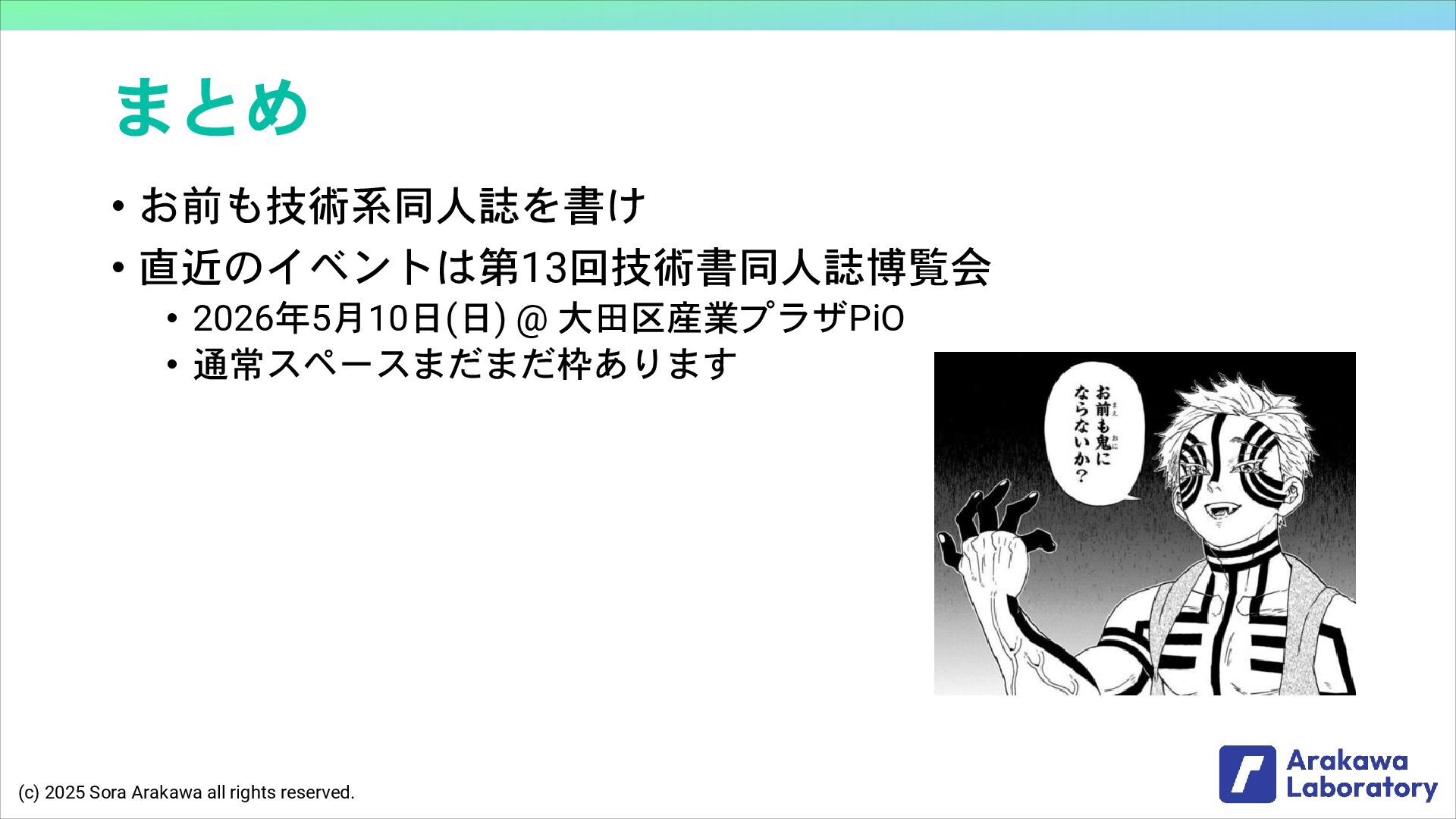(c) 2025 Sora Arakawa all rights reserved. まとめ • お前も技術系同人誌を書け