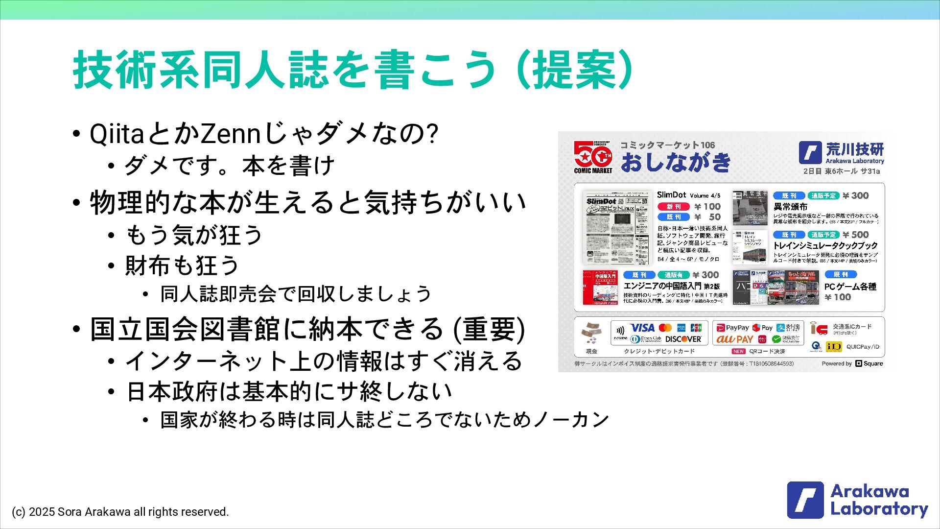 (c) 2025 Sora Arakawa all rights reserved. 技術系同人誌を書こう (提案) •