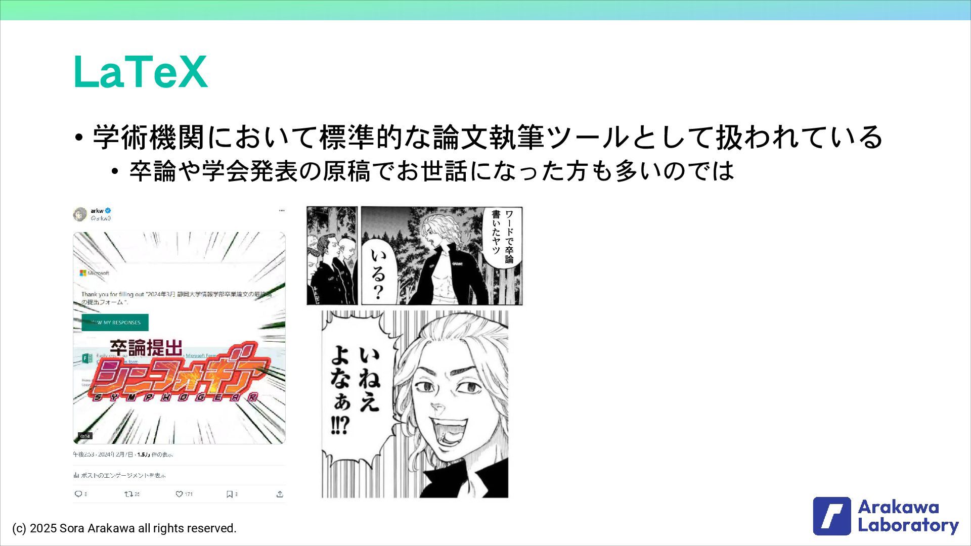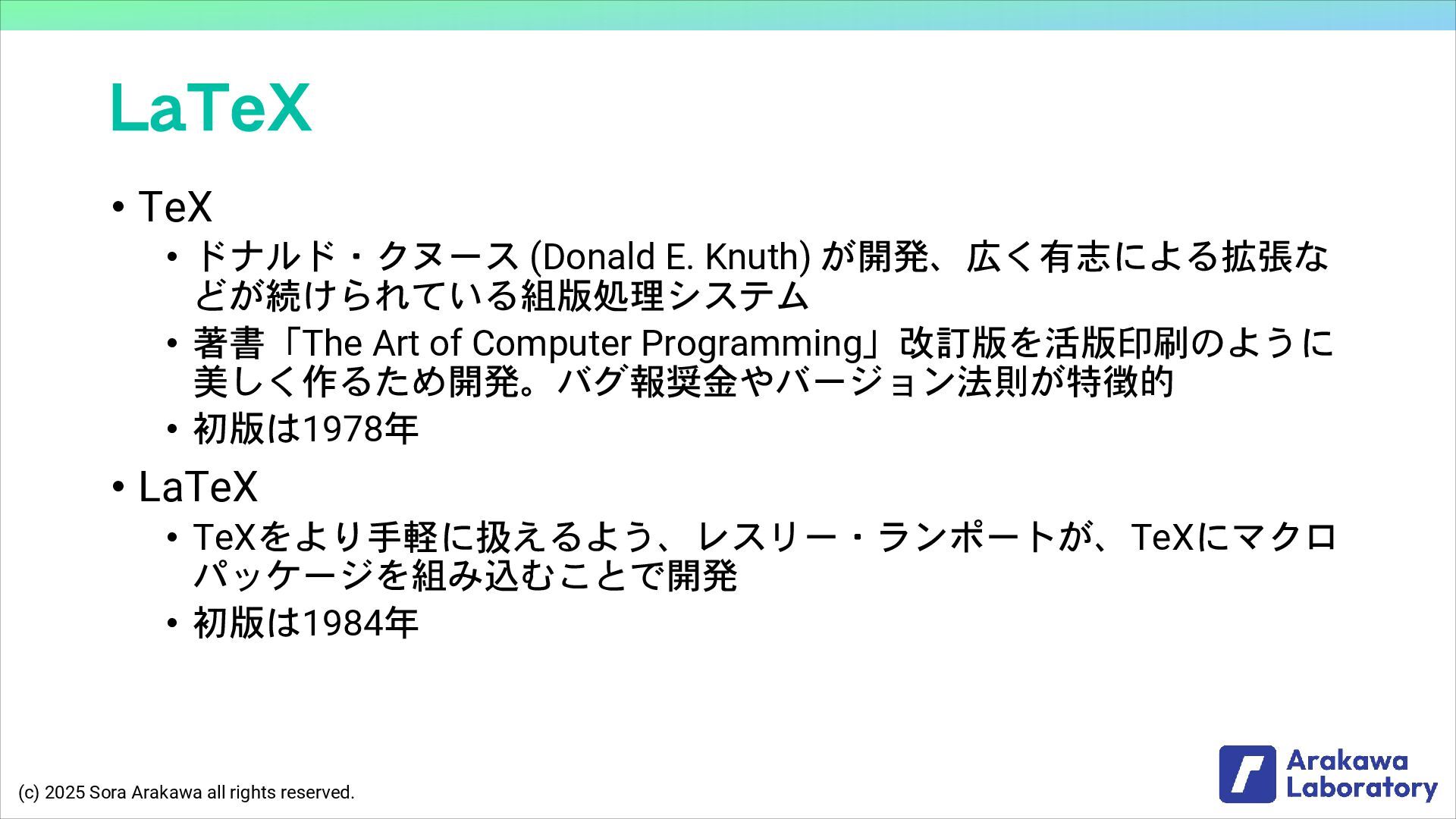 (c) 2025 Sora Arakawa all rights reserved. LaTeX • 学術機関において標準的な論文執筆ツールとして扱われている