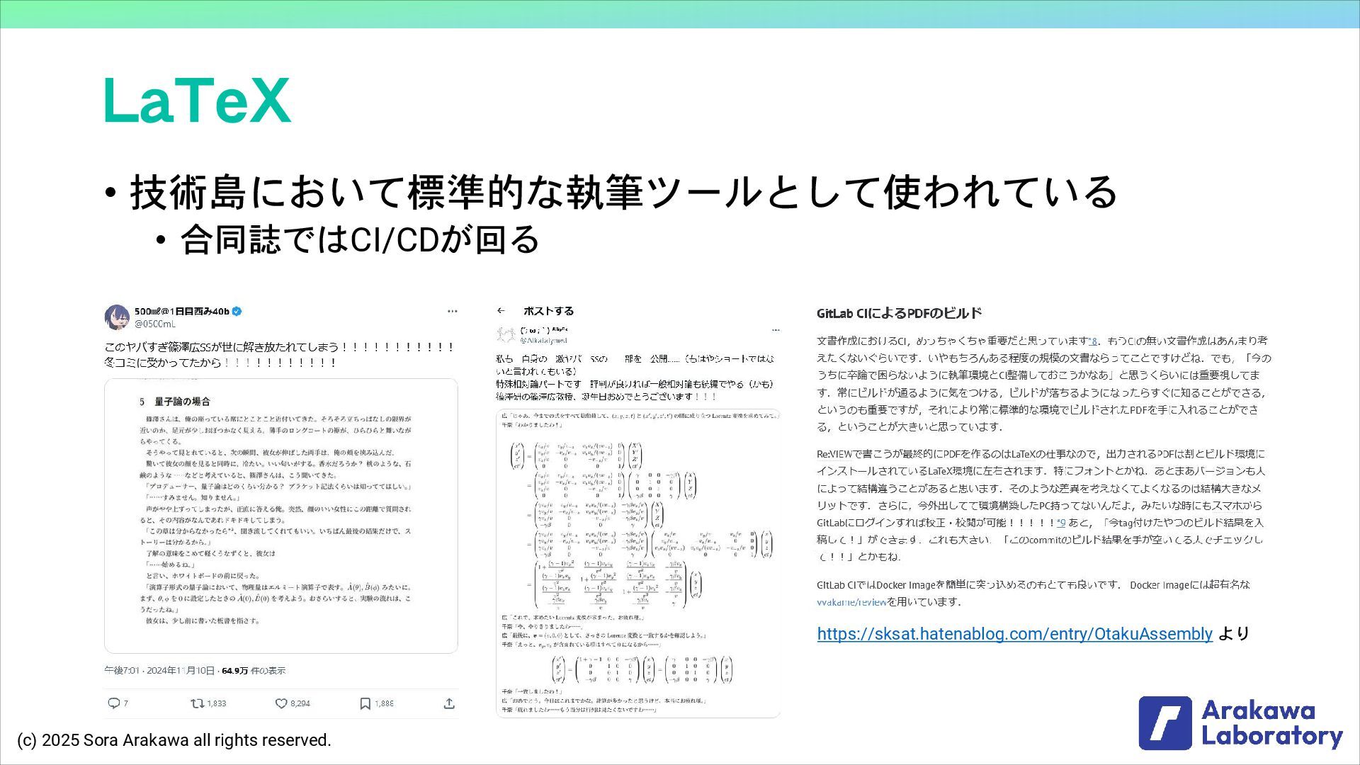 (c) 2025 Sora Arakawa all rights reserved. LaTeX • 技術島において標準的な執筆ツールとして使われている