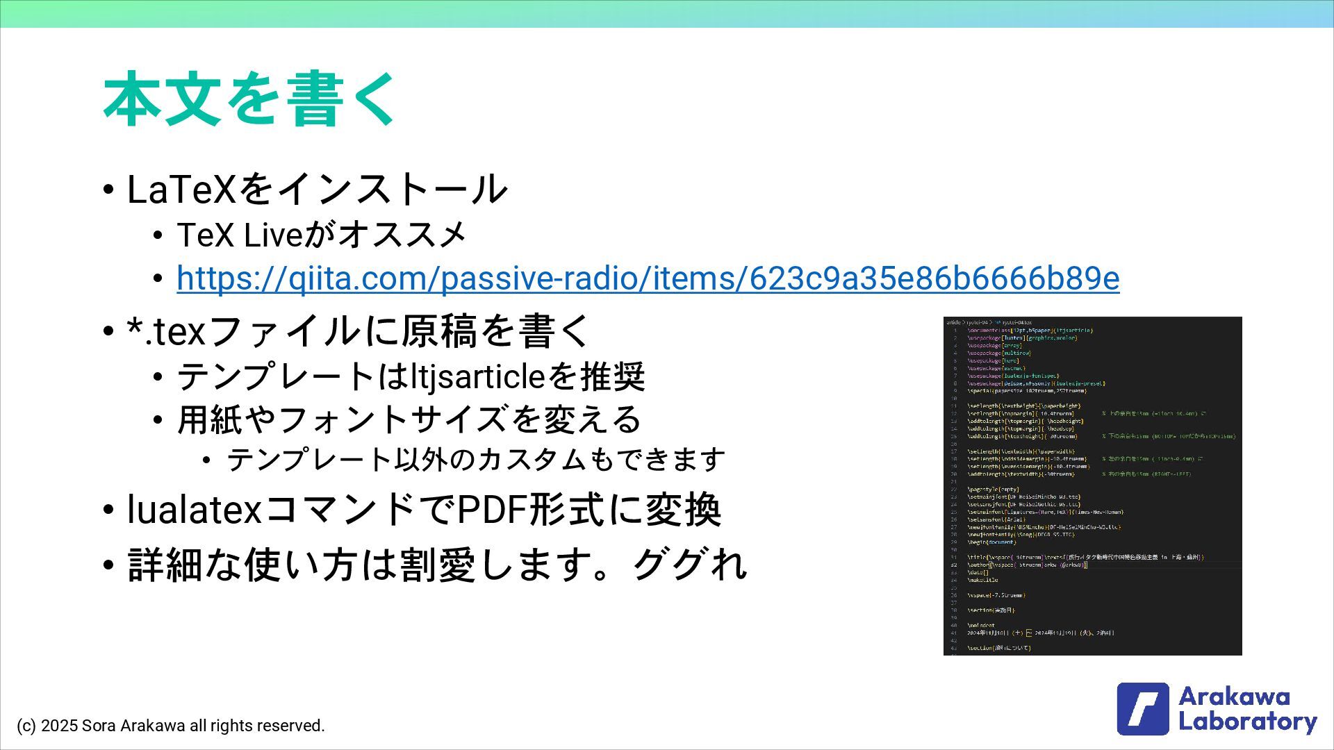 (c) 2025 Sora Arakawa all rights reserved. 本文を書く • LaTeXをインストール