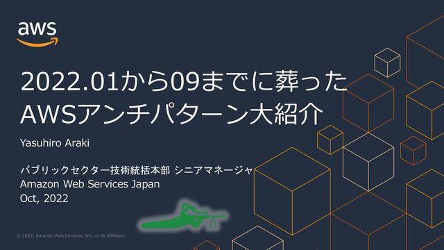Araki パブリックセクター技術統括本部 シニアマネージャ Amazon Web Services Japan Oct, 2022 2022.01から09までに葬った AWSアンチパターン⼤紹介