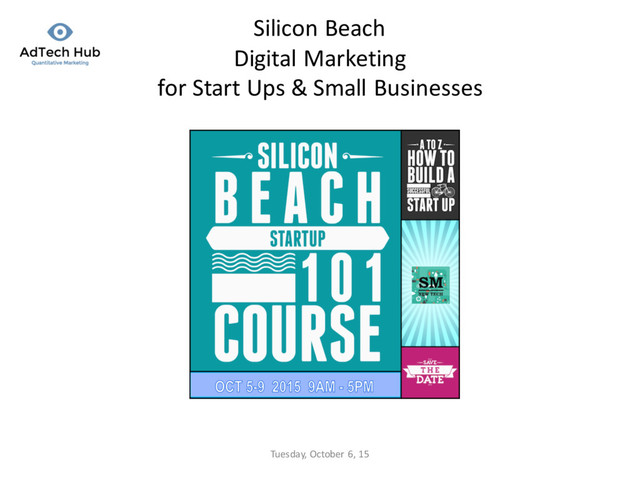 Instagram, LinkedIn • Targeting – Facebook • Location, Age, Gender, Languages, Relationship, Education, Work, Financial, Home, Ethnic Affinity, Politics, Life Events, Interests, Behaviors, Device • Custom audience by uploading a list • Lookalike audience • Website ReTargeting – LInkedin • Location, company name, industry, company size, individual job title, function, seniority, member skills, schools, what degree they have and field of study, member groups they participate in, gender and age – Twitter • Target competitors, brands, industry media, influencers, and those with a similar audience and following • Metrics – Performance: reach, frequency, clicks – Engagement: Page likes, Comments, Sharing, video views – Website conversions: downloads, contact page, purchases, app installs … 5/19/16 Silicon Beach Digital Marketing for Startups 13