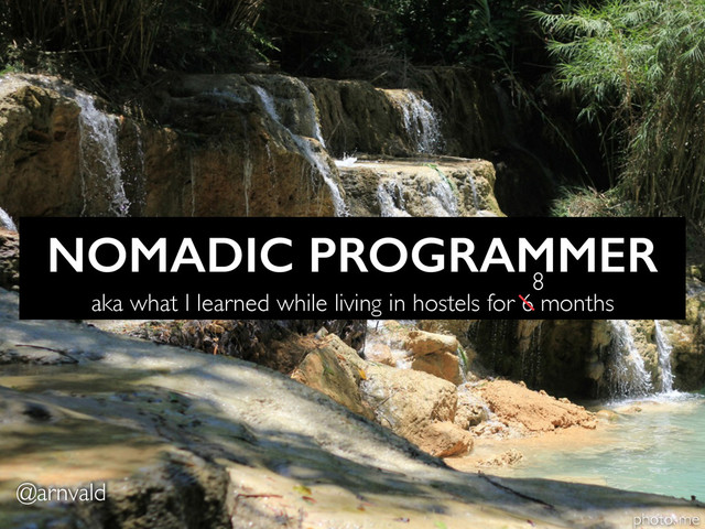 Updated version of my "Nomadic programmer" lightning talk - just a few minor changes. The slides are useless without the talk, but I'll add it here as soon as the video's released