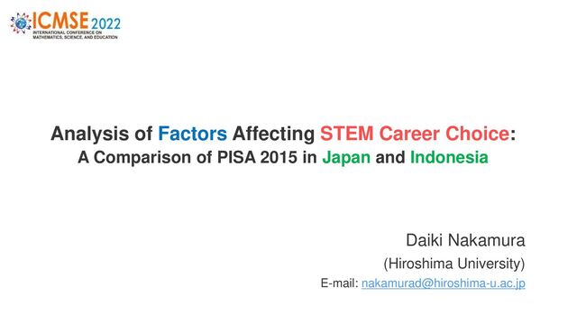 Data from 15-years-old students in Japan and Indonesia in the PISA 2015 survey. (N=6647) (N=6513) ➢ Analysis • Path analysis for data from both countries. • Checking for goodness of fit. • Estimation of direct and indirect effects. This study aims to identify the factors that influence STEM career choice and the gender differences in Japan and Indonesia based on SCCT. Specifically, the following research questions will be explored: • RQ1: Does the SCCT model fit the Japanese and Indonesian data? • RQ2: What influences STEM career choice? • RQ3: Are there gender differences in STEM career choice factors? • RQ4: What can be done to increase the number of STEM career choosers?