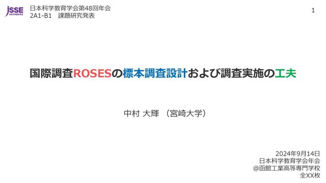 中村大輝. 国際調査ROSESの標本調査設計および調査実施の工夫. 日本科学教育学会第48回年会, 口頭発表, 2024年9月14日, 函館工業専門学校. https://doi.org/10.14935/jssep.48.0_109