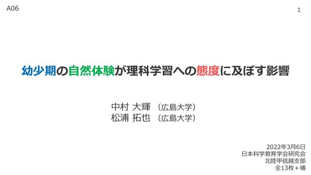 Stecker, R., Wong, K., & Shapiro, E. (2007) : Young children's environmental attitudes and behaviors. Environment and behavior, 39(5), 635–658. • 浜銀総合研究所(2021):令和2年度文部科学省委託調査 青少年の体験活動に関する調査研究 報告書. • 星野匡郎,田中久稔.(2016):R による実証分析 回帰分析から因果分析へ,オーム社.. • 星野崇宏(2009):調査観察データの統計科学 因果推論・選択バイアス・データ融合,岩波書店. • 岩崎学(2015):統計的因果推論,朝倉書店. • 木村治生(2020):「子どもの生活と学び」研究プロジェクトについて,東京大学社会科学研究所・ベネッセ教育総合研究所 (編)子どもの学びと成長を追う:2万組の親子パネル調査から(pp. 3–26),勁草書房. • 厚生労働省(2017):保育所保育指針. • Kuo, M., Barnes, M., & Jordan, C. (2019) : Do experiences with nature promote learning? Converging evidence of a cause-and-effect relationship. Frontiers in psychology, 10, 305. • 文部科学省(2017):幼稚園教育要領. • Rosenbaum, P. R., & Rubin, D. B. (1983) : The central role of the propensity score in observational studies for causal effects. Biometrika, 70(1), 41–55. • 高橋将宜(2022):統計的因果推論の理論と実装,共立出版. • 高橋多美子,高橋敏之(2010):幼少期における自然体験と自然科学への関心・自然に対する心情との関連性,理科教育学研究, 50(3),117–125. • Weeland, J., Moens, M. A., Beute, F., Assink, M., Staaks, J. P., & Overbeek, G. (2019) : A dose of nature: Two three- level meta-analyses of the beneficial effects of exposure to nature on children's self-regulation. Journal of Environmental Psychology, 65, 101326. • Wells, N. M., & Lekies, K. S. (2006) : Nature and the life course: Pathways from childhood nature experiences to adult environmentalism. Children Youth and Environments, 16(1), 1–24.