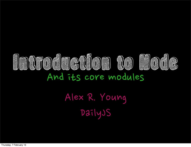 require('fs'); http.createServer(function(req, res) { var stream = fs.createReadStream('index.html'); stream.pipe(res); }).listen(8000); Thursday, 7 February 13