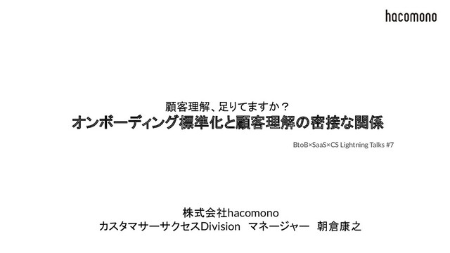 顧客理解、足りてますか? オンボーディング標準化と顧客理解の密接な関係 株式会社hacomono カスタマサーサクセスDivision マネージャー 朝倉康之 BtoB×SaaS×CS Lightning Talks #7