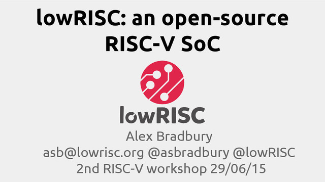 ◦ Memo on tagged memory and minions ◦ Blog ◦ phab.lowrisc.org bug-tracker and Wiki • irc.oftc.net #lowRISC • Keen to collaborate rather than duplicate effort! • Give feedback, explore collaborations etc: [email protected] @asbradbury @lowRISC • European lowRISC/RISC-V event in October? Get involved