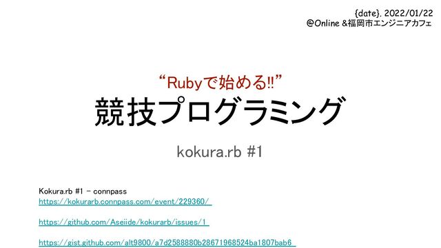 “Rubyで始める!!” 競技プログラミング kokura.rb #1 {date}. 2022/01/22 @Online &福岡市エンジニアカフェ Kokura.rb