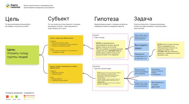 без примесей форм реализации Ситуация: описание контекста ситуации, входа в неё Формы решений: образцы типовых технических решений, то чем оснащаем действие, какими инструментами и средствами Способ действия: вариант формы процесса Объекты оперирования: совокупность и структура вещей, задействованных в действии до его начала и как результат Носитель действия: субъект или машина, кому вменено действие/ операция Карта Реализации Историй Ц 2.1. Направить оказавшихся в этих местах зверей в зону отлова/ отстрела По сигналу начала охоту Шумелки: две палки, стучащие друг о друга, трещётки, вувзелы, ... С шумом бежать через лес в форме сужающегося полумесяца Предполагаемое пространство местонахождения зверей, звуки движения зверей, овнутрённая схема локации и понимание местоположения участников Громкий общий сигнал: рожок, горн, ... Пока не подан сигнал Тихо заседать с оружием в засаде в ожидании волны зверей Предполагаемое пространство местонахождения зверей, овнутрённая схема локации и понимание местоположения участников Одна группа людей, загонщики Ц 2.2. Оказаться вблизи со зверем для его пленения/ ранения Другая группа людей, стрелки́ При визуальном контакте со зверем Оружие: копья, луки, ножи Ранить зверя или поймать Движущиеся звери, наблюдаемые визуально Ц 2.3. Обездвижить зверя Другая группа людей, стрелки́ Приспособления для ловли: сеть Ц 1.1. Достичь быстрого зверя за счёт лишения его сил Каждый раз, когда зверь остановится передохнуть Запасы еды и воды Осторожно сокращать дистанцию до него, чтобы не дать ему восстановить силы Местоположение и состояние зверя Средства пленения Преследователь