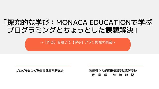 ~【作る】を通じて【学ぶ】アプリ開発の実践~ 秋田県立大館国際情報学院高等学校 商 業 科 津 嶋 涼 悦 プログラミング教育実践事例研究会 「探究的な学び:MONACA EDUCATIONで学ぶ プログラミングとちょっとした課題解決」