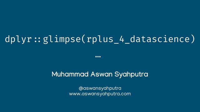 dplyr::glimpse(rplus_4_datascience) Muhammad Aswan Syahputra @aswansyahputra www.aswansyahputra.com ...