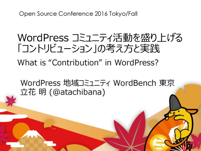 OSC 2016 Tokyo/Fall - What is "Contribution" in WordPress by Akira Tachibana 29 http://www.slideshare.net/mekemoke/wordcamp-tokyo-2016-lt 課題 対策 できることが限られる 人数が少なく60分もたない 一見さんが多く、次回来ない 発言タイミングがずれる