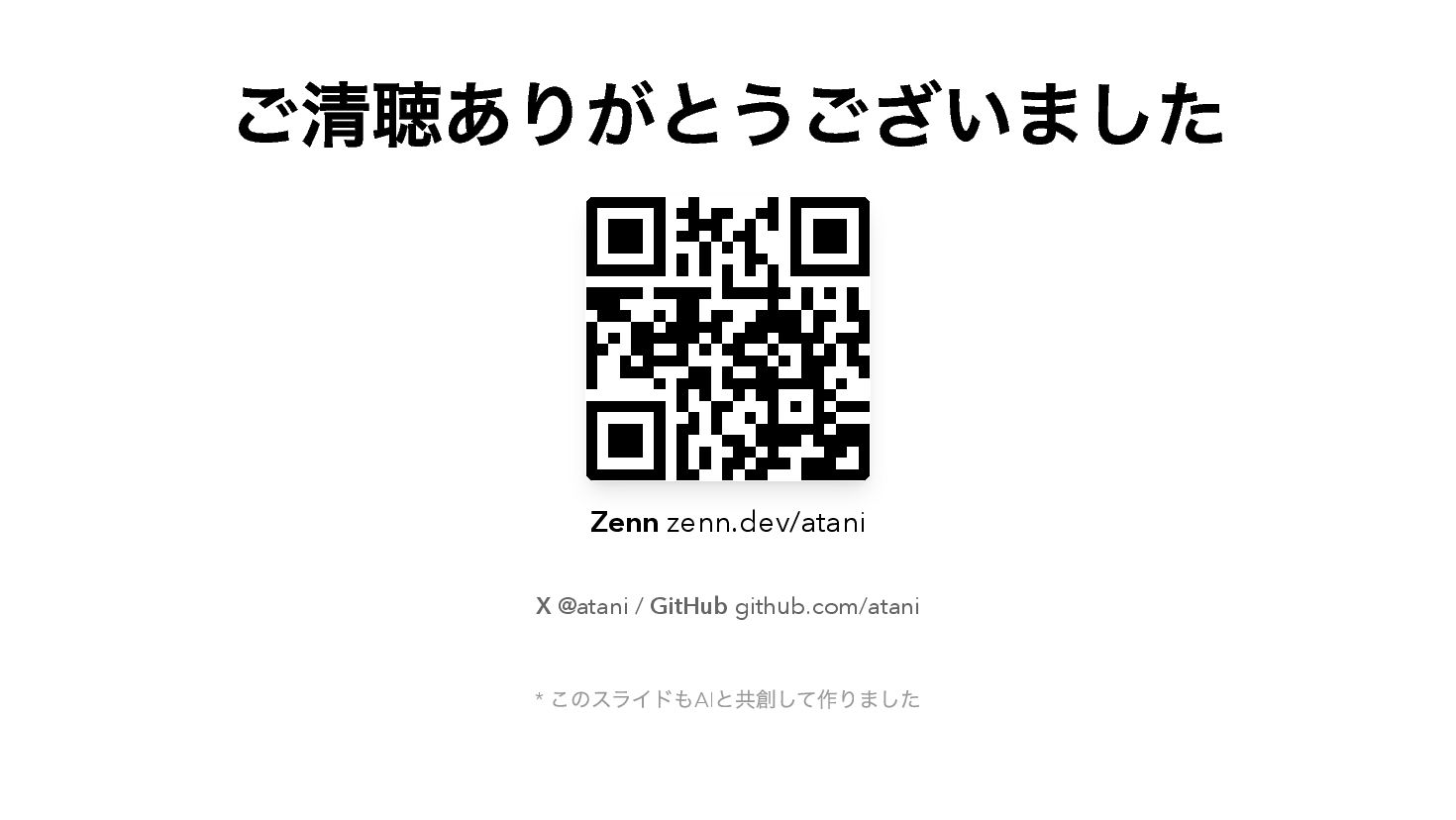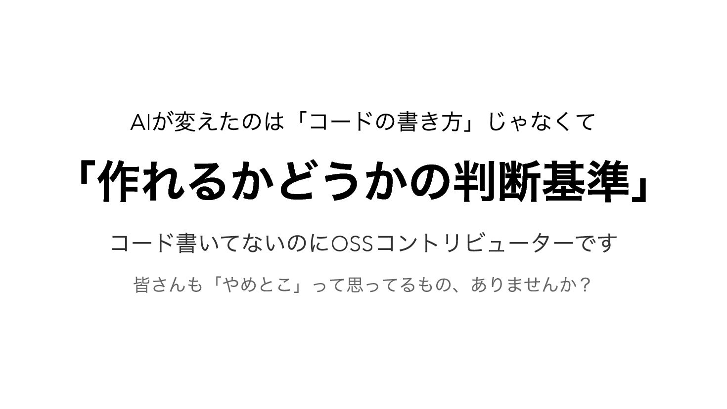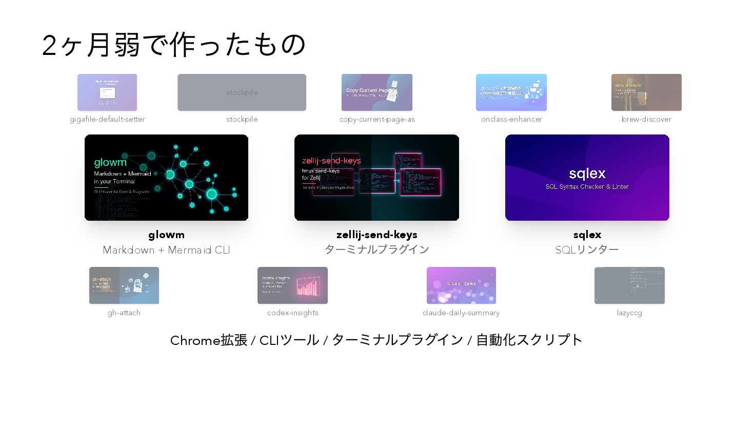 AIとの共創開発で2ヶ月弱に12個以上のツールを作り、Zennに22本の記事を書いた体験談。Claude CodeやCodex CLIとの具体的な開発事例(zellij-send-keys、glowm)を紹介しながら、AIが変えたのは「コードの書き方」ではなく「作れるかどうかの判断基準」だったという気づきを共有します。