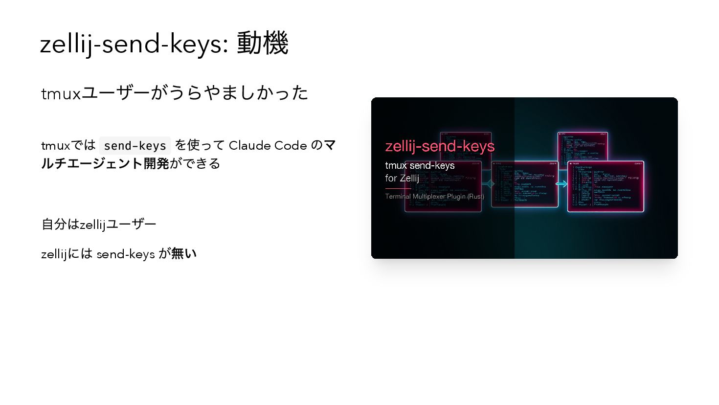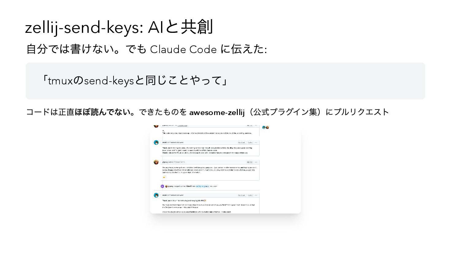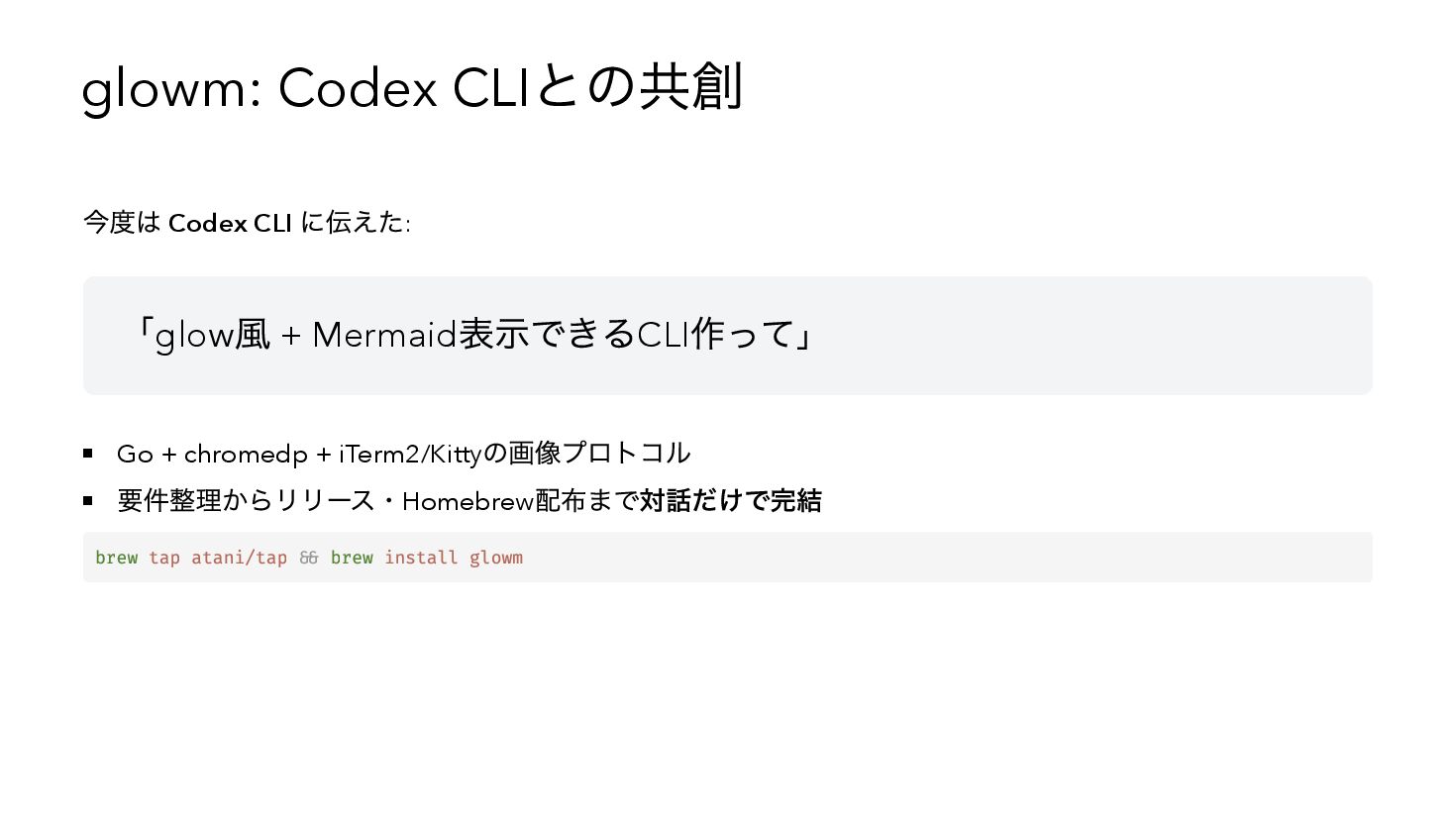 AIとの共創開発で2ヶ月弱に12個以上のツールを作り、Zennに22本の記事を書いた体験談。Claude CodeやCodex CLIとの具体的な開発事例(zellij-send-keys、glowm)を紹介しながら、AIが変えたのは「コードの書き方」ではなく「作れるかどうかの判断基準」だったという気づきを共有します。