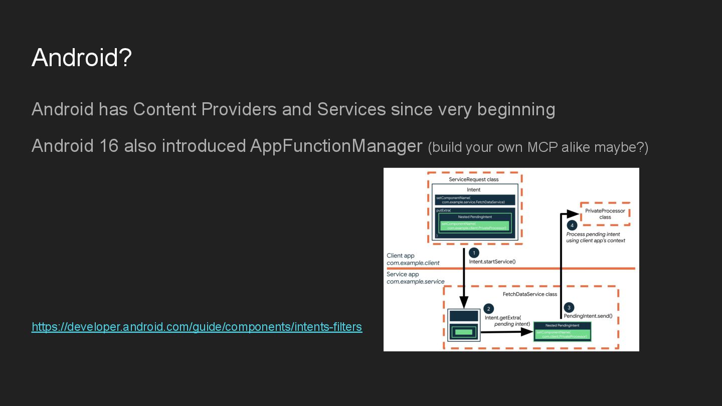 Android 16 also introduced AppFunctionManager (build your own MCP alike maybe?) https://developer.android.com/guide/components/intents-filters