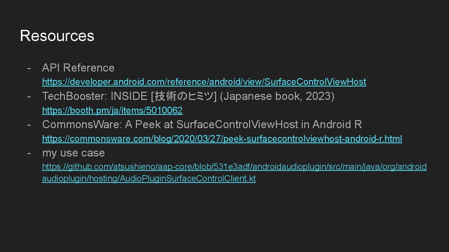 book, 2023) https://booth.pm/ja/items/5010062 - CommonsWare: A Peek at SurfaceControlViewHost in Android R https://commonsware.com/blog/2020/03/27/peek-surfacecontrolviewhost-android-r.html - my use case https://github.com/atsushieno/aap-core/blob/531e3adf/androidaudioplugin/src/main/java/org/android audioplugin/hosting/AudioPluginSurfaceControlClient.kt